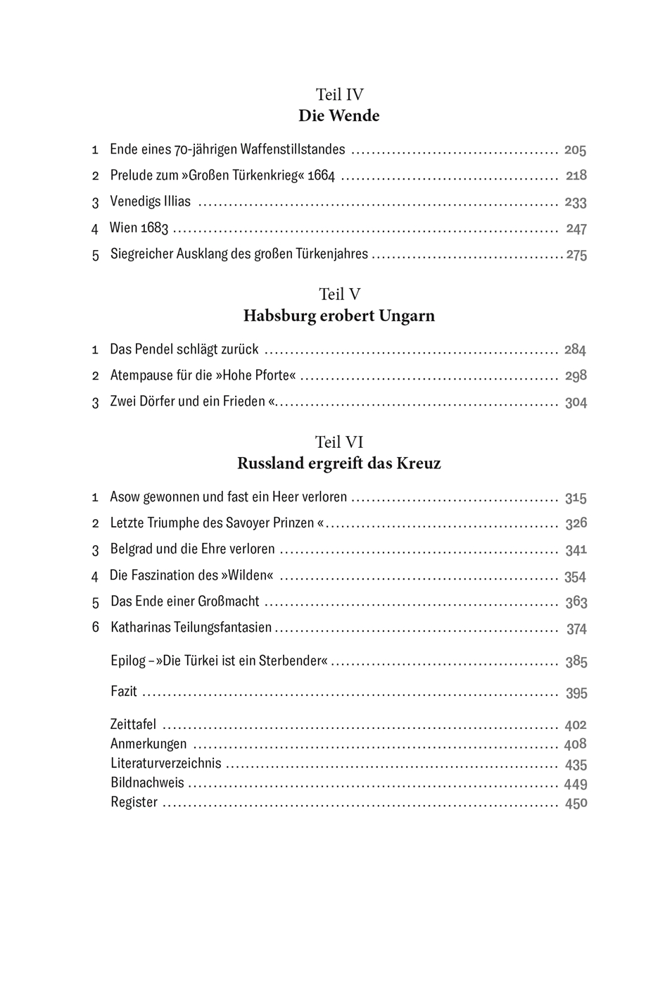 Von der Fiktion der einigen Christenheit zum territorialen Machtstaat 7Teil IEin Weltreich des Schreckens1. Prolog an Save, Drau und Mur 212. Fürsten des Horizonts 353. Ungarns Untergang in Etappen 484. Ein Spanier in Wien und die vergiftete ungarische Erbschaft 695. »Mit Freuden getrost dreinschlagen« 826. 1532! - Das Duell der kaiserlichen Giganten findet nicht statt 88Teil IISeekrieg1. Triumph in Tunis (1535) - Scheitern vor Algier (1541) 992. Der »Skandal von Toulon« 1133. Todeskampf auf Malta (1565) 1234. Der Fall von Szigetvár (1566) 137.5. Venedig kämpft um sein Überleben 1456. Epilog in Algier 163Teil IIIIn Ungarn nichts Neues1. Der »Lange Türkenkrieg« von 1593 bis 1606 1712. Zwischen Türkenfurcht und Obrigkeitskritik 1873. Das lange Ende des »Langen Türkenkrieges« (1606) 194Teil IVDie Wende1. Ende eines 70-jährigen Waffenstillstandes 2052. Prelude zum »Großen Türkenkrieg« 1664 2183. Venedigs Illias 2334. Wien 1683 2475. Siegreicher Ausklang des großen Türkenjahres 275Teil VHabsburg erobert Ungarn1. Das Pendel schlägt zurück 2842. Atempause für die »Hohe Pforte« 2983. Zwei Dörfer und ein Frieden «304Teil VIRussland ergreift das Kreuz1. Asow gewonnen und fast ein Heer verloren 3152. Letzte Triumphe des Savoyer Prinzen « 3263. Belgrad und die Ehre verloren 3414. Die Faszination des »Wilden« 3545. Das Ende einer Großmacht 3636. Katharinas Teilungsfantasien 374Epilog - »Die Türkei ist ein Sterbender« 385Fazit395Zeittafel 402Anmerkungen 408Literaturverzeichnis 435Bildnachweis 449Register 450