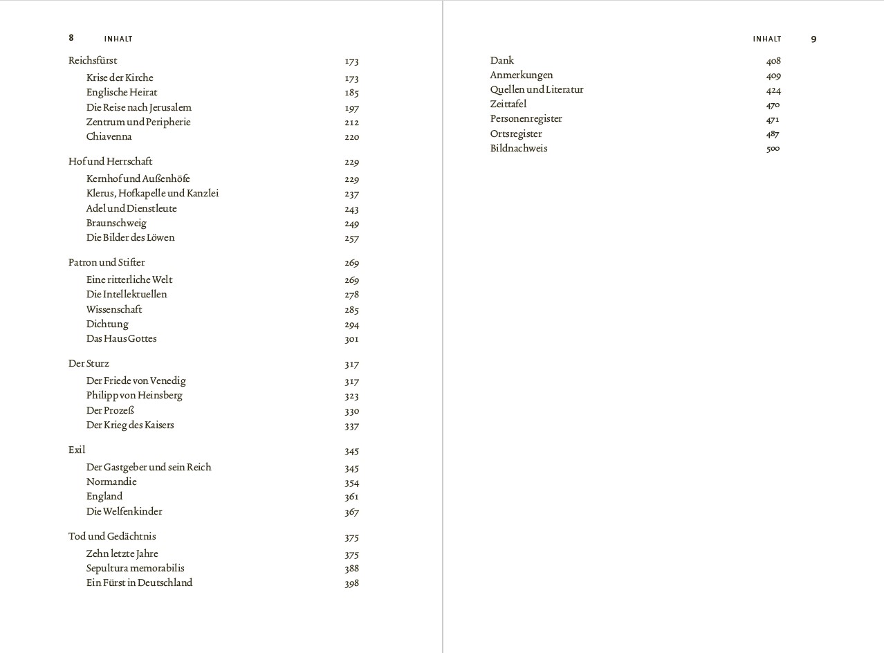 Prolog: Annäherungen 11Die Welfen, Sachsen und das Reich 21Die Familie 21Heinrich der Schwarze 31Kaiser Lothar III. 36Heinrich der Stolze 41Der Erbe und seine Leute 47Erste Jahre 47Das Land nördlich der Elbe 59Die Güter der Grafen von Stade 65Nordöstlicher Kreuzzug 70An der Schwelle zur Macht 75Die größere Welt 79Im Gefolge des Königs 79Italienzug 88Herzog von Bayern 96Zwischen Dänemark und Rom 101Herzog 115Herrschaft in Sachsen 115Bischöfe, Fürsten und Herren 130Der sächsische Krieg 141Das neue Land 149Der neue Herr 157Ein Herzog für Bayern? 162Reichsfürst 173Krise der Kirche 173Englische Heirat 185Die Reise nach Jerusalem 197Zentrum und Peripherie 212Chiavenna 220Hof und Herrschaft 229Kernhof und Außenhöfe 229Klerus, Hofkapelle und Kanzlei 237Adel und Dienstleute 243Braunschweig 249Die Bilder des Löwen 257Patron und Stifter 269Eine ritterliche Welt 269Die Intellektuellen 278Wissenschaft 285Dichtung 294Das Haus Gottes 301Der Sturz 317Der Friede von Venedig 317Philipp von Heinsberg 323Der Prozeß 330Der Krieg des Kaisers 337Exil 345Der Gastgeber und sein Reich 345Normandie 354England 361Die Welfenkinder 367Tod und Gedächtnis 375Zehn letzte Jahre 375Sepultura memorabilis 388Ein Fürst in Deutschland 398Dank 408Anmerkungen 409Quellen und Literatur 424Zeittafel 466Personenregister 467Ortsregister 483Bildnachweis 496