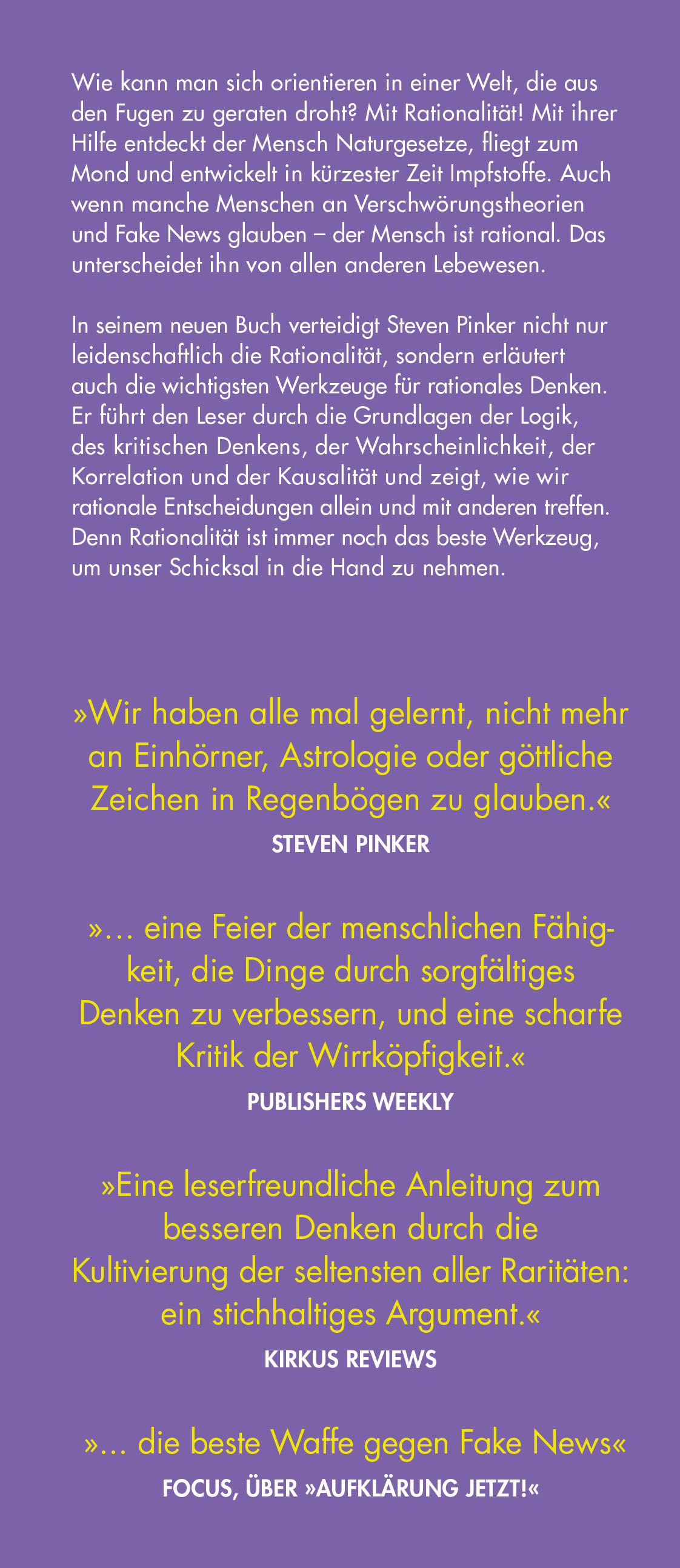 Steven Pinker verteidigt aber nicht nur die Rationalität und zeigt ihre Stärken auf; er erläutert auch die wichtigsten Werkzeuge für rationales Denken. Er führt den Leser durch die Grundlagen der Logik und des kritischen Denkens, er erklärt Wahrscheinlichkeit und die Rolle des Zufalls, das Verhältnis von Glaube und Evidenz, Risiko und Statistik. Nach diesem Grundkurs in Rationalität sind wir gewappnet, rationale Entscheidungen allein und mit anderen viel besser treffen zu können. Denn Rationalität ist immer noch das beste Werkzeug, um unser Schicksal in die Hand zu nehmen.