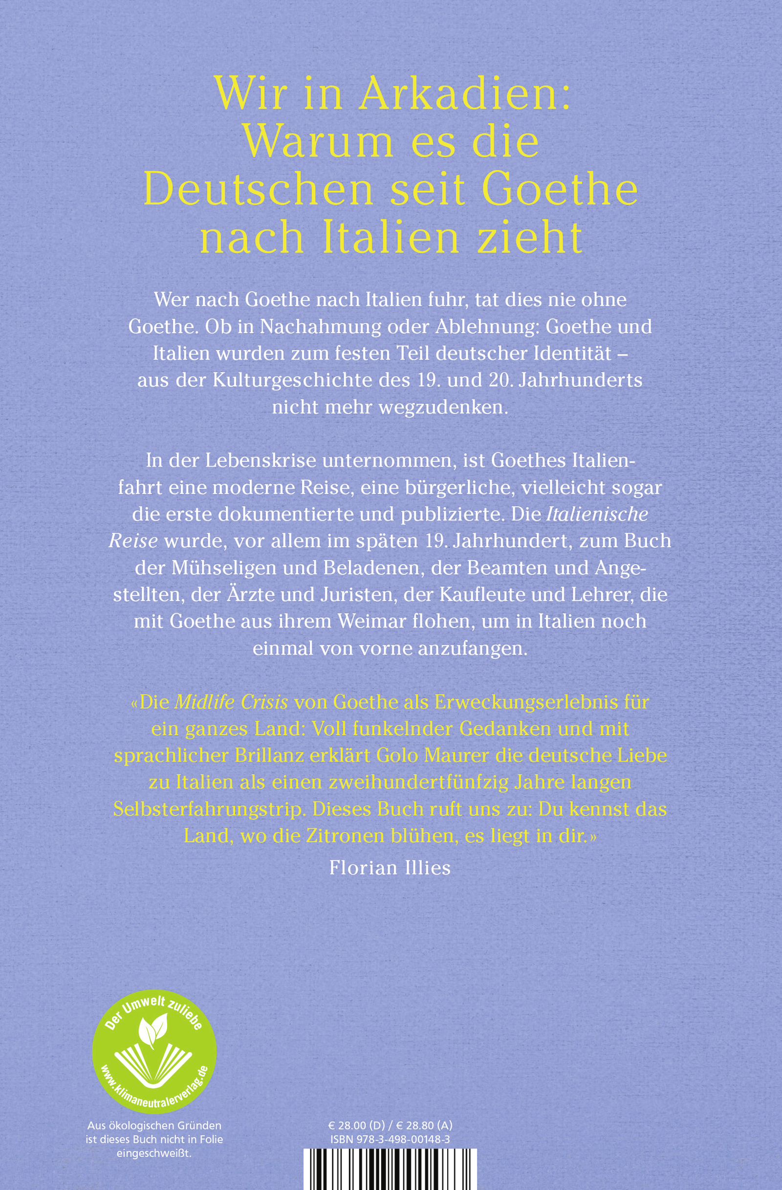 Golo Maurer zeigt, wie ebenjene Selbsterfahrung Goethes in Italien für die Generationen nach ihm zum Vorbild wurde. Karl Friedrich Schinkel reiste im frühen, Richard Wagner im späten 19. Jahrhundert nach Italien, die Brüder Mann, Walter Benjamin, Sigmund Freud, der sich einen «Italienpilger» nannte - Goethe hatte ihnen die Messlatte gesetzt: «Dem denkenden und fühlenden Menschen geht ein neues Leben, ein neuer Sinn auf, wenn er diesen Ort betritt.»
