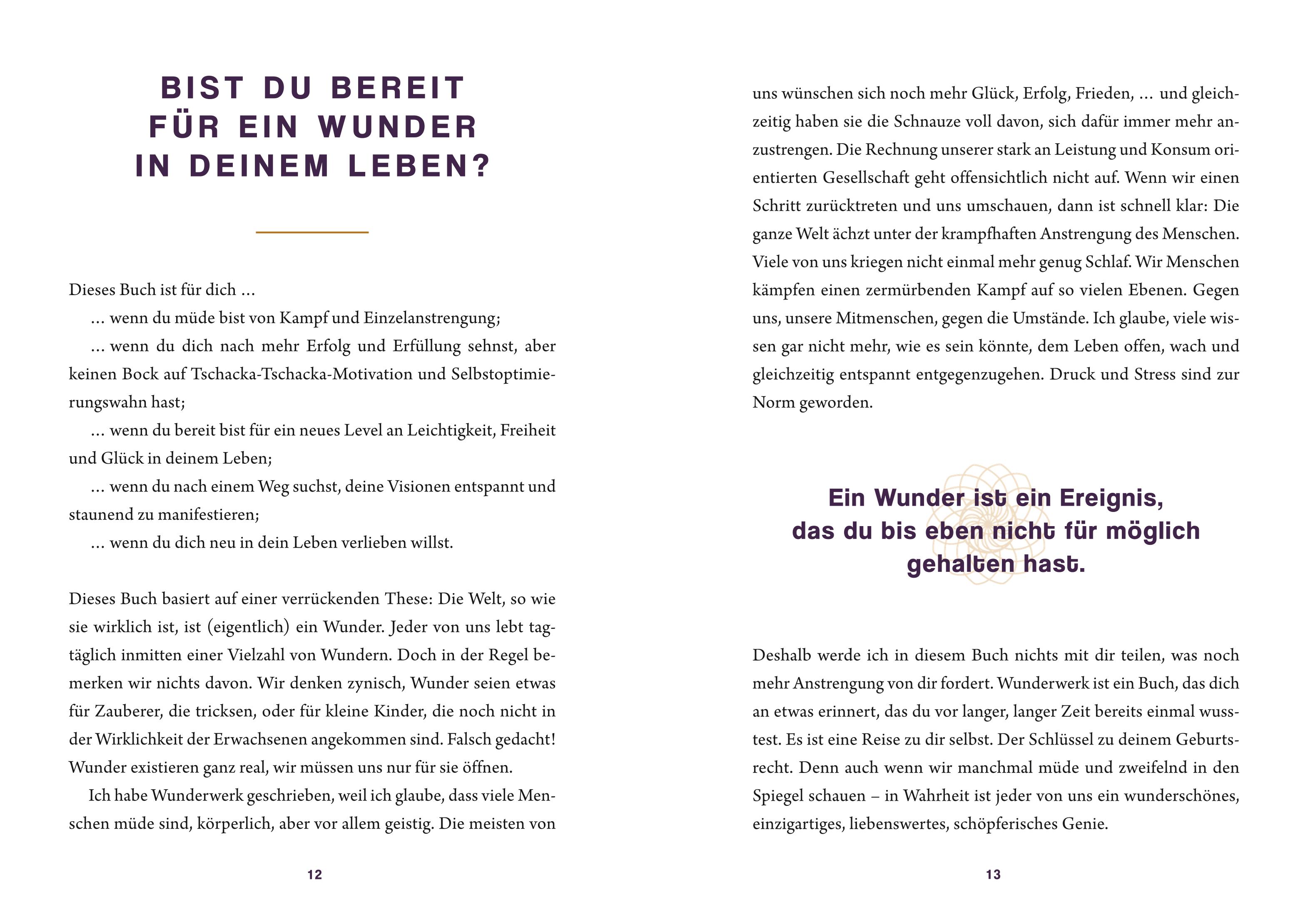 wunderwerk ist das sanfteste und zugleich radikalste Buch, das ich je geschrieben habe. Sanft, weil es nicht darum geht, dich noch mehr anzustrengen. Im Gegenteil. Ich lade dich ein, aufzuhören, gegen dein Licht und die Wunder deines Lebens zu kämpfen. Geh einfach mit deinem Rechthaben und deiner ermüdenden Einzelanstrengung aus dem Weg und lass das geschehen, wonach du dich schon so lange sehnst. Öffne dich für die Magie des Lebens. Es ist zugleich das radikalste meiner Bücher, weil es sich auf die Wurzel allen Leids und allen Glücks konzentriert - deinen Geist.