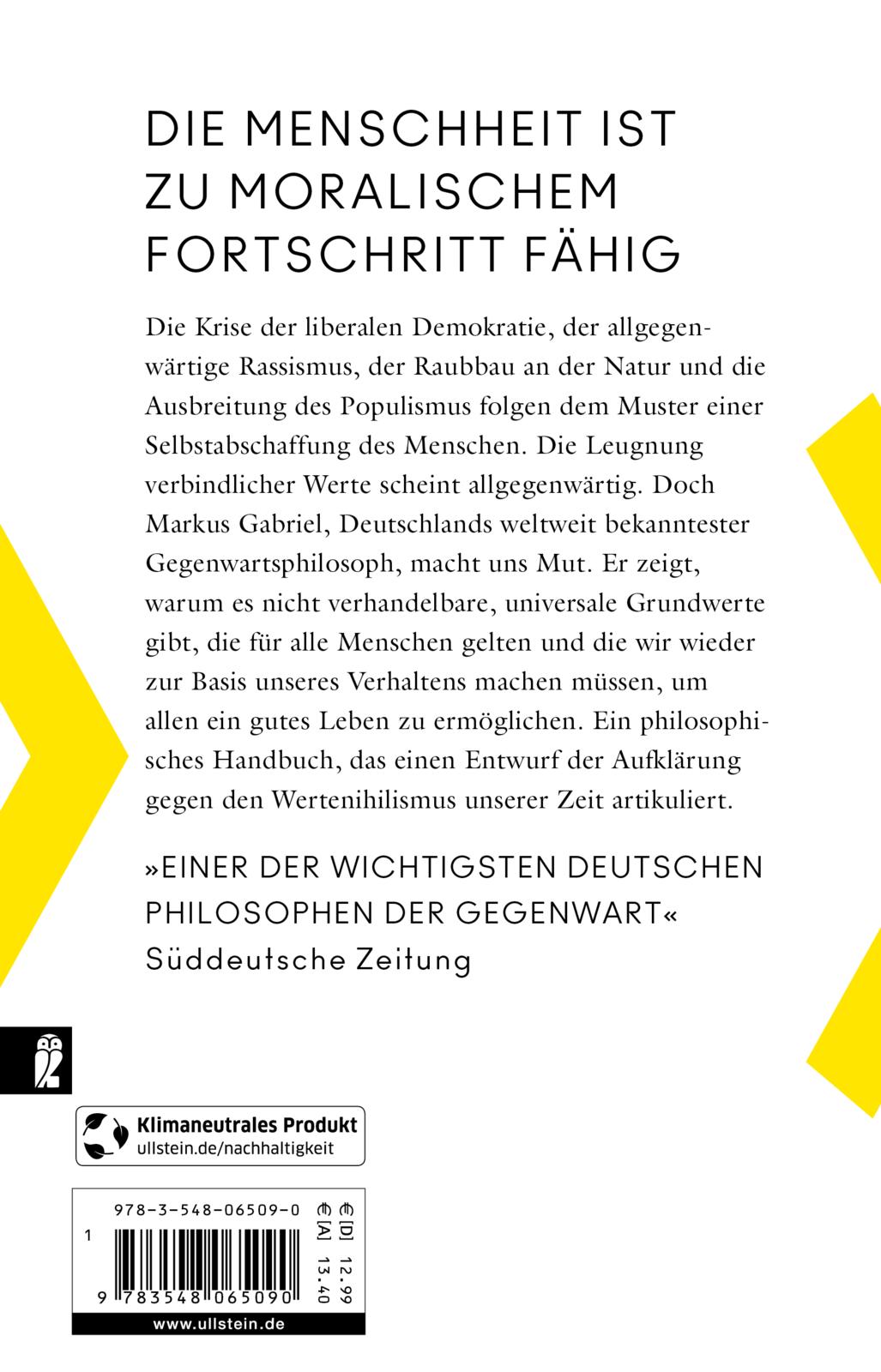 Die Krise der liberalen Demokratie und die Ausbreitung des Populismus folgen dem Muster einer Selbstabschaffung des Menschen. Der Diskurs über Künstliche Intelligenz und die hemmungslose Digitalisierung verstärken diese fatale Entwicklung noch. Doch trotz aller gegenwärtigen Rückschläge: Die Menschheit ist zu moralischem Fortschritt fähig. In seinem engagierten Buch zeigt Markus Gabriel, Deutschlands weltweit bekanntester Gegenwartsphilosoph, warum es nicht verhandelbare, universale Grundwerte gibt, die für alle Menschen gelten. Er zeigt: Wir bedürfen dringend eines innovativen Konzepts der Kooperation von Wissenschaft, Politik, Wirtschaft, um ein Gesellschaftssystem zu entwerfen, das auf moralischen Fortschritt zielt.