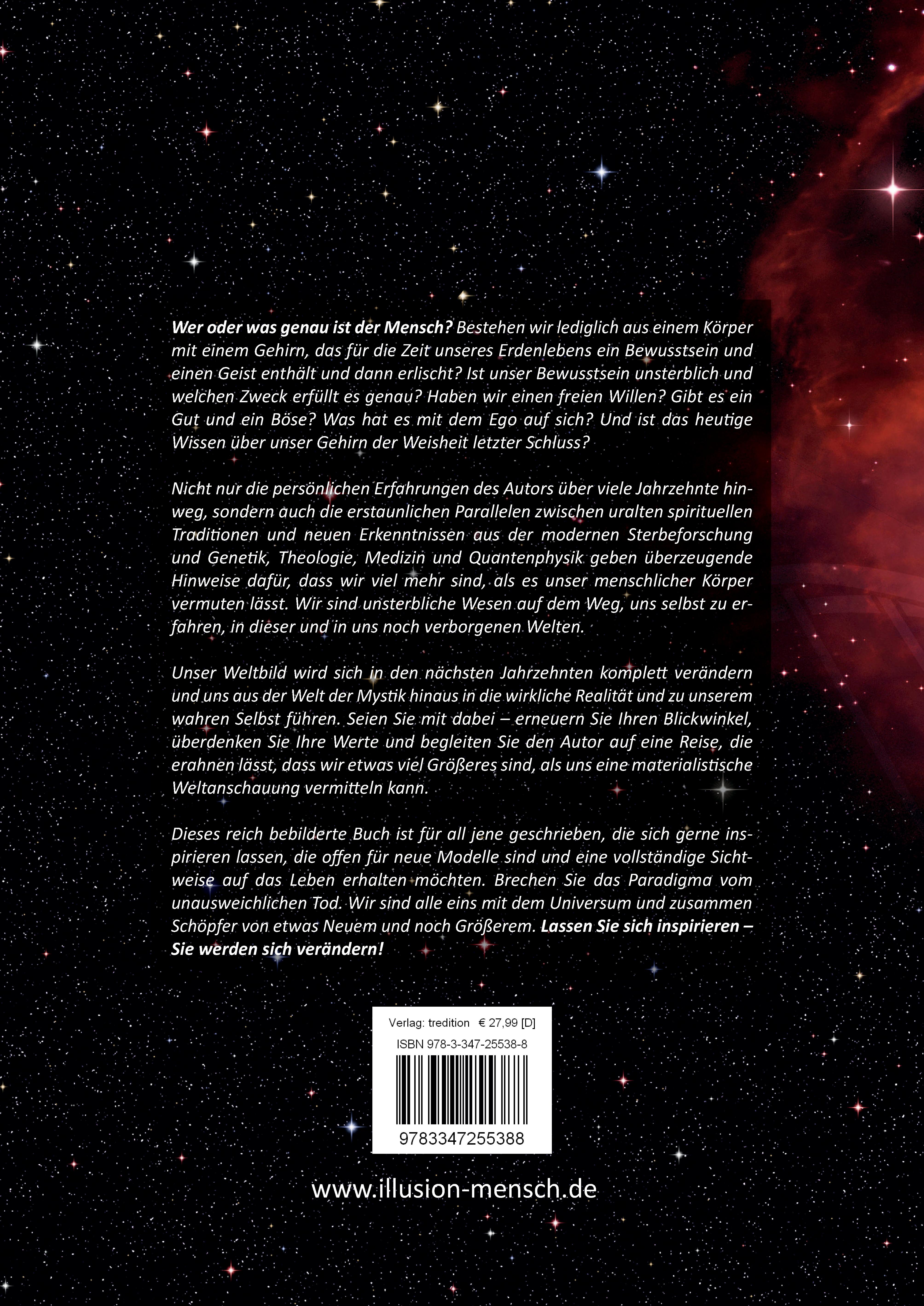 Informationen zum Titel Wer oder was genau ist der Mensch? Bestehen wir lediglich aus einem Körper mit einem Gehirn, das für die Zeit unseres Erdenlebens ein Bewusstsein und einen Geist enthält und dann erlischt? Ist unser Bewusstsein unsterblich und welchen Zweck erfüllt es genau? Haben wir einen freien Willen? Gibt es ein Gut und ein Böse? Was hat es mit dem Ego auf sich? Und ist das heutige Wissen über unser Gehirn der Weisheit letzter Schluss? Nicht nur die persönlichen Erfahrungen des Autors über viele Jahrzehnte hinweg, sondern auch die erstaunlichen Parallelen zwischen uralten spirituellen Traditionen und neuen Erkenntnissen aus der modernen Sterbeforschung und Genetik, Theologie, Medizin und Quantenphysik geben überzeugende Hinweise dafür, dass wir viel mehr sind, als es unser menschlicher Körper vermuten lässt. Wir sind unsterbliche Wesen auf dem Weg, uns selbst zu erfahren, in dieser und in uns noch verborgenen Welten. Unser Weltbild wird sich in den nächsten Jahrzehnten komplett verändern und uns aus der Welt der Mystik hinaus in die wirkliche Realität und zu unserem wahren Selbst führen. Seien Sie mit dabei - erneuern Sie Ihren Blickwinkel, überdenken Sie Ihre Werte und begleiten Sie den Autor auf eine Reise, die erahnen lässt, dass wir etwas viel Größeres sind, als uns eine materialistische Weltanschauung vermitteln kann. Dieses reich bebilderte Buch ist für all jene geschrieben, die sich gerne inspirieren lassen, die offen für neue Modelle sind und eine vollständige Sichtweise auf das Leben erhalten möchten. Brechen Sie das Paradigma vom unausweichlichen Tod. Wir sind alle eins mit dem Universum und zusammen Schöpfer von etwas Neuem und noch Größerem. Lassen Sie sich inspirieren - Sie werden sich verändern.