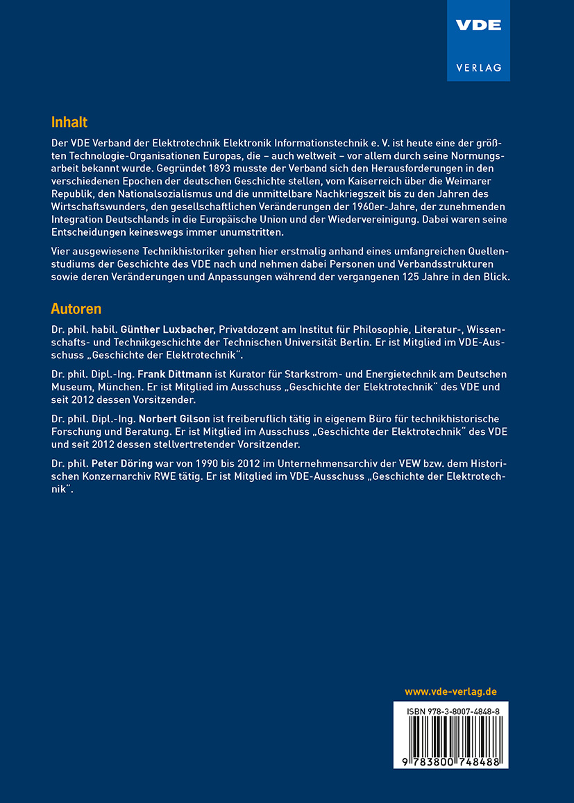 Dr. phil. Dipl.-Ing. Frank Dittmann ist Kurator für Starkstrom- und Energietechnik am Deutschen Museum, München. Er ist Mitglied im Ausschuss "Geschichte der Elektrotechnik" des VDE und seit 2012 dessen Vorsitzender. Dr. phil. habil. Günther Luxbacher, Privatdozent am Institut für Philosophie, Literatur-, Wissenschafts- und Technikgeschichte der Technischen Universität Berlin. Er ist Mitglied im VDE-Ausschuss "Geschichte der Elektrotechnik". Dr. phil. Dipl.-Ing. Norbert Gilson ist freiberuflich tätig in eigenem Büro für technikhistorische Forschung und Beratung. Er ist Mitglied im Ausschuss "Geschichte der Elektrotechnik" des VDE und seit 2012 dessen stellvertretender Vorsitzender. Dr. phil. Peter Döring war von 1990 bis 2012 im Unternehmensarchiv der VEW bzw. dem Historischen Konzernarchiv RWE tätig. Er ist Mitglied im VDE-Ausschuss "Geschichte der Elektrotechnik".