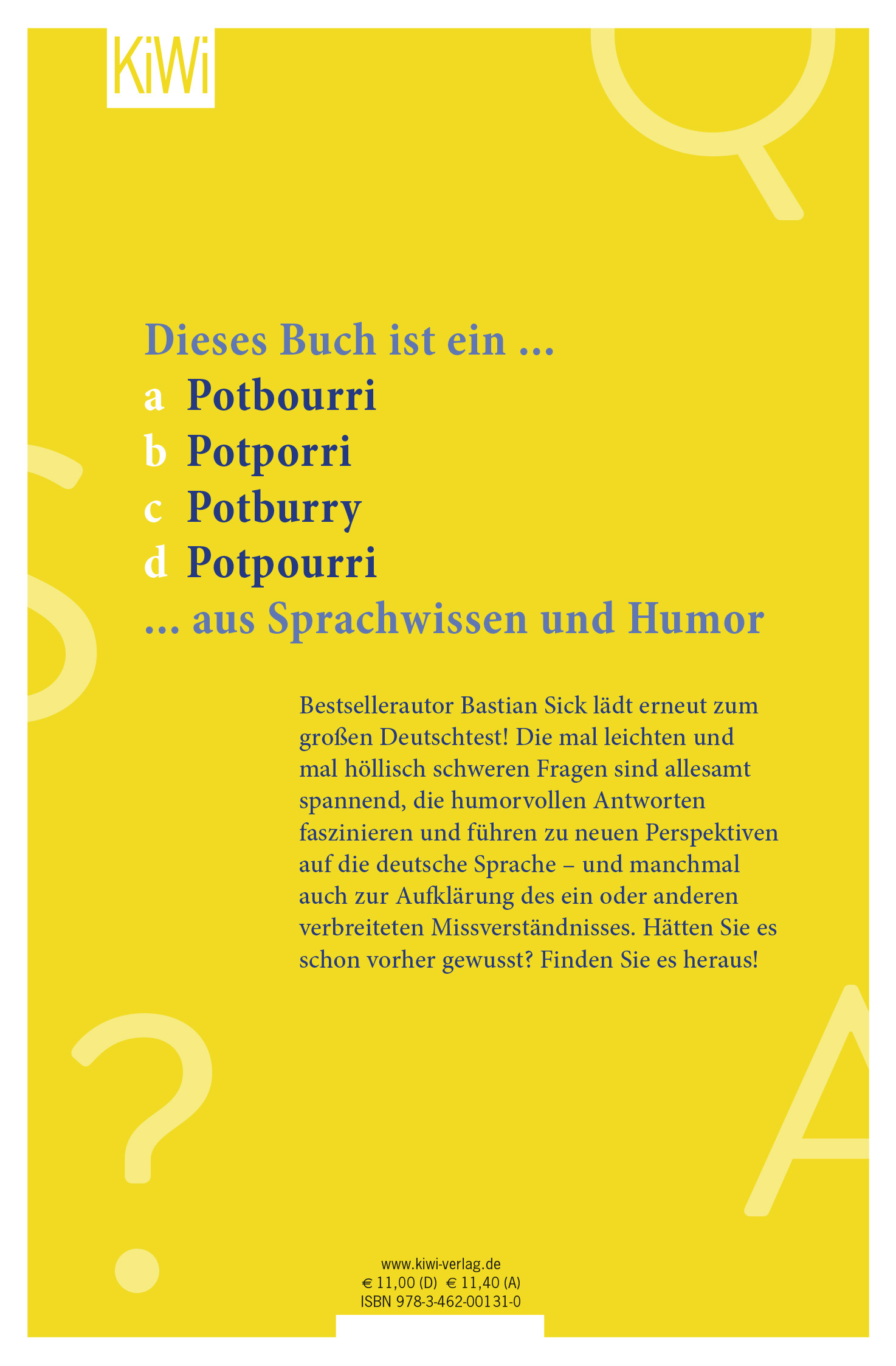 Was ist eine Kaltmamsell? Ist der Feinschmecker ein Gourmand, ein Gourmet, ein Bonvivant oder ein Sommelier? Wie nennen die Berliner den Berliner? Und wer war eigentlich die ursprüngliche treulose Tomate? Zum dritten Mal lädt Bestsellerautor Bastian Sick zum großen Deutschtest, und wieder wartet er nur mit den erlesensten und spannendsten Fragen auf. Manche sind leicht, manche sind schwer, die Antworten jedoch sind ausnahmslos immer faszinierend! Kurioses, Kniffliges und Humorvolles - rund um Wortschatz, Grammatik, Rechtschreibung oder Sprachgeschichte - lösen Aha-Momente aus und führen zu neuen Perspektiven auf die deutsche Sprache. Und manchmal auch zur Aufklärung des ein oder anderen verbreiteten Missverständnisses. Hätten Sie es schon vorher gewusst? Finden Sie es heraus!