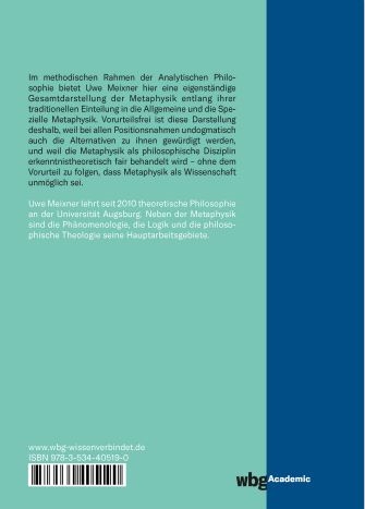 Im methodischen Rahmen der Analytischen Philosophie bietet das Buch eine eigenständige Gesamtdarstellung der Metaphysik entlang ihrer traditionellen Einteilung in die Allgemeine und die Spezielle Metaphysik. Vorurteilsfrei ist diese Darstellung deshalb, weil bei allen Positionsnahmen undogmatisch auch die Alternativen zu ihnen gewürdigt werden, sowie deshalb, weil die Metaphysik als philosophische Disziplin erkenntnistheoretisch fair behandelt und nicht dem Vorurteil gefolgt wird, Metaphysik sei als Wissenschaft unmöglich. Zur Sprache kommen die Kategorien- und die Transzendentalienlehre, die allgemeinmetaphysischen Prinzipien sowie die großen Themen: Ich, Welt, Gott. Wenn auch das Bestreben im Mittelpunkt steht, einen eigenen systematischen Entwurf hinzustellen, so fehlt es dem Buch dennoch nicht an eingehender Diskussion der Konzeptionen anderer Metaphysiker. Von besonderer Bedeutung sind dabei Platon, Leibniz, Frege, Meinong und David Lewis.