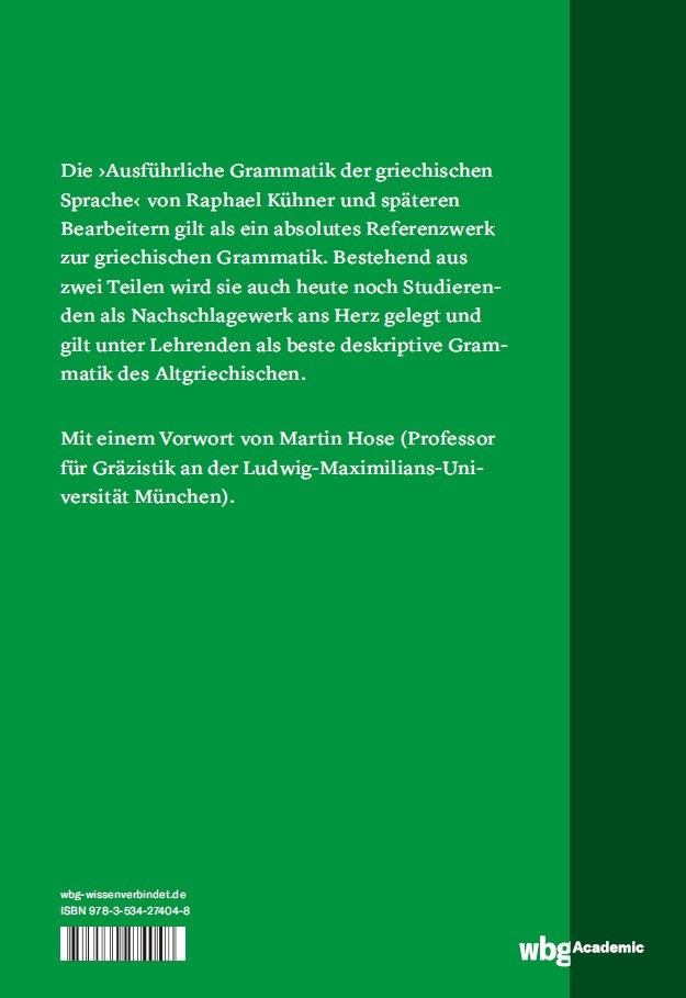 Die 'Ausführliche Grammatik der griechischen Sprache' von Raphael Kühner und späteren Bearbeitern gilt bis heute als absolutes Referenzwerk zur griechischen Grammatik. Bestehend aus zwei Teilen wird sie auch heute noch Studenten als Nachschlagewerk ans Herz gelegt und gilt unter Lehrenden als beste deskriptive Grammatik des Altgriechischen.