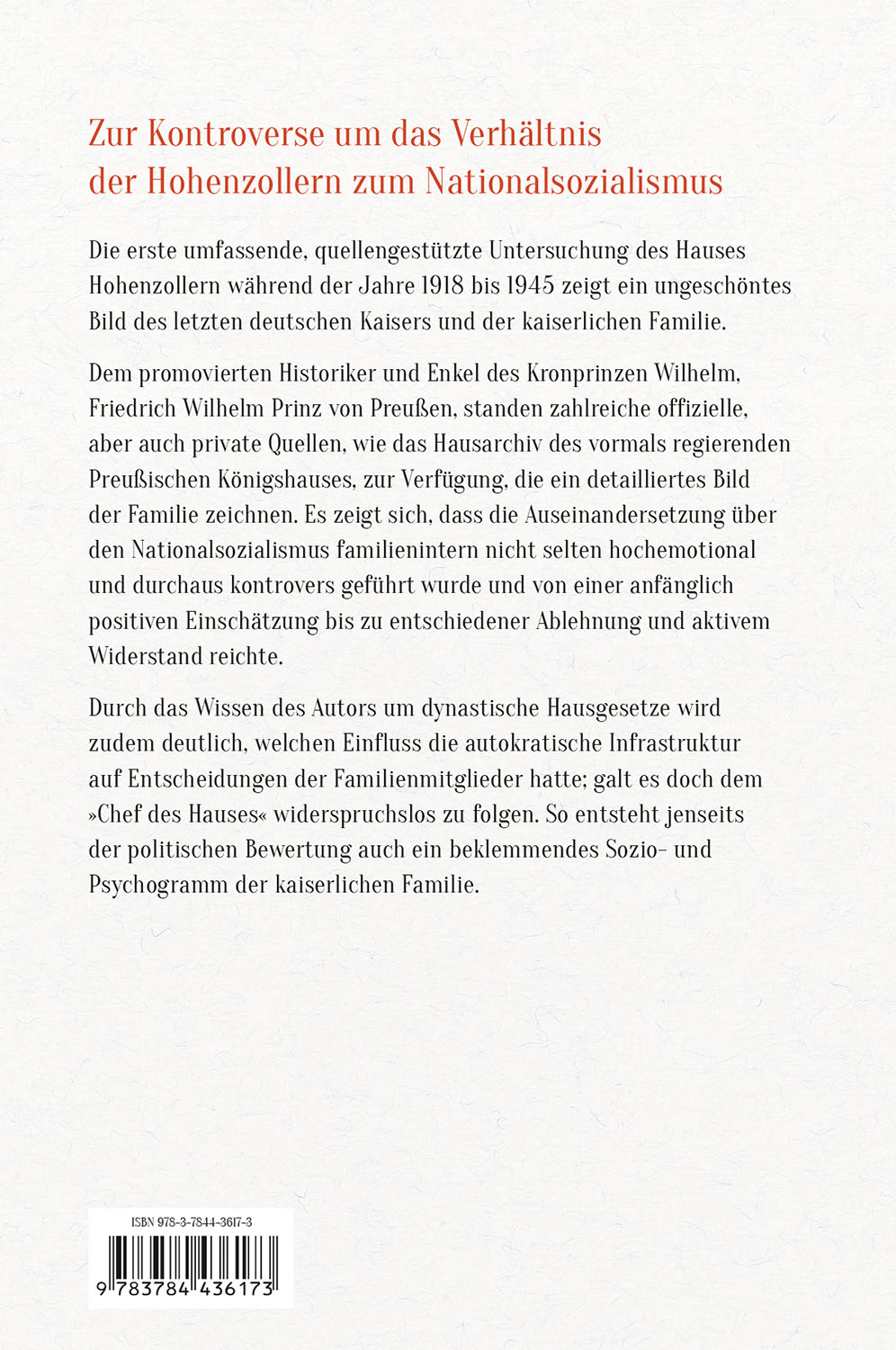 Die erste umfassende, quellengestützte Untersuchung der Rolle des Hauses Hohenzollern während der Jahre 1918 bis 1945 rückt das Bild des letzten deutschen Kaisers und der kaiserlichen Familie zurecht, das immer wieder starken Verzerrungen ausgesetzt war und ist. Dem Historiker Friedrich Wilhelm Prinz von Preußen lagen offizielle und persönliche Dokumente aus nicht öffentlich zugänglichen Archiven vor. Sie zeigen, dass im Hause Hohenzollern die Auseinandersetzung mit den Nationalsozialisten durchaus kontrovers geführt wurde. Sie reichte von einer anfänglich positiven Einschätzung bis zu entschiedener Ablehnung und schließlich aktivem Widerstand.