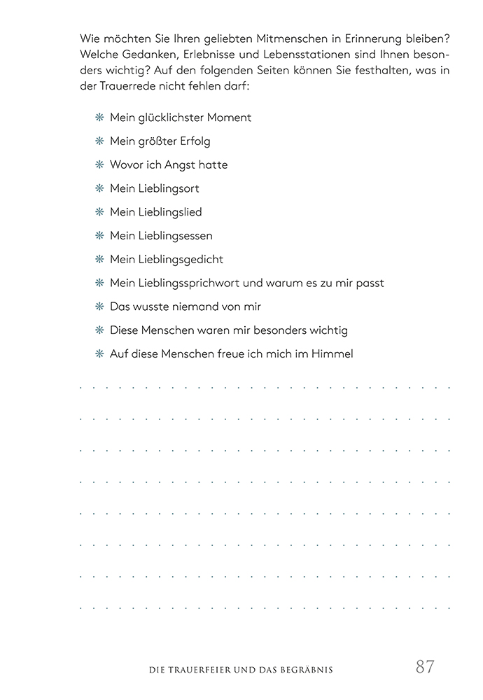 Der Gedanke an den eigenen Tod, die Vorereitung auf den letzten Weg, fällt oft schwer. Dieses schön und hochwertig gestaltete Ausfüllbuch ist eine einfühlsame Hilfestellung, sowohl für den Betroffenen als auch für Angehörige und Hinterbliebene. Zahlreiche Fragestellungen können feinfühlend und persönliche beantwortet werden, beispielsweise: Wie stelle ich mir meine letzten Tage vor? Wer ist im Todesfall zu informieren? Wie soll meine Trauerfeier und meine Beisetzung gestaltet sein? Wo sind wichtige Unterlagen? Gibt es Dinge, die ich Angehörigen noch mitteilen möchte? Impulse und Bibelverse helfen, sich auf den Ernstfall vorzubereiten. Übersichtliche Checklisten, die sich individuell gestalten lassen, erleichtern die Organisation. Ein praktisches Fach nimmt wichtige Dokumente und Briefe auf.