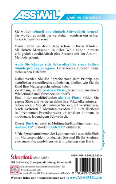 Schwedisch ohne Mühe, Lehrbuch - Niveau A1-B2Dieser progressiv aufgebaute ASSiMiL-Selbstlernkurs bietet Ihnen einen leichten Einstieg in die schwedische Sprache und ermöglicht es Ihnen, in 100 Lektionen umfassend die Grundlagen des Schwedischen zu erlernen.Der Sprachkurs richtet sich an Einsteiger, die die schwedische Sprache gerade erst für sich entdeckt haben sowie an Fortgeschrittene, die ihre Kenntnisse auffrischen und vertiefen möchten. Am Ende erreichen Sie das sprachliche Niveau der Stufe B2 des Gemeinsamen Europäischen Referenzrahmens für Sprachen; dies entspricht ungefähr 6 Semestern VHS. Die in den Lektionen vermittelten Strukturen und der erlernte Wortschatz machen Sie fit für die mühelose Kommunikation in vielen Alltagssituationen. In weniger als einem Jahr werden Sie sich auf Schwedisch unterhalten können und das ganz ohne Auswendiglernen und Grammatikpauken.Kurze Lektionen in übersichtlicher Gestaltung fördern Ihren Lernerfolg:- Fremdsprachige Dialoge mit sinngemäßer und teilweise auch wörtlicher deutscher Übersetzung werden durch kurze, präzise Anmerkungen zu Grammatik, Vokabular und bestimmten sprachlichen Phänomenen ergänzt.- Verständnis- und Lückentextübungen helfen Ihnen, Ihren Lernfortschritt zu überprüfen.- In regelmäßigen Wiederholungslektionen wird der Stoff vertieft und anhand von Beispielen systematisch verdeutlicht, so dass Sie das Gelernte aufarbeiten und festigen können.Dieser Sprachkurs ist auch als Lernsoftware und mit Tonaufnahmen erhältlich.Sprachen: Deutsch, Schwedisch