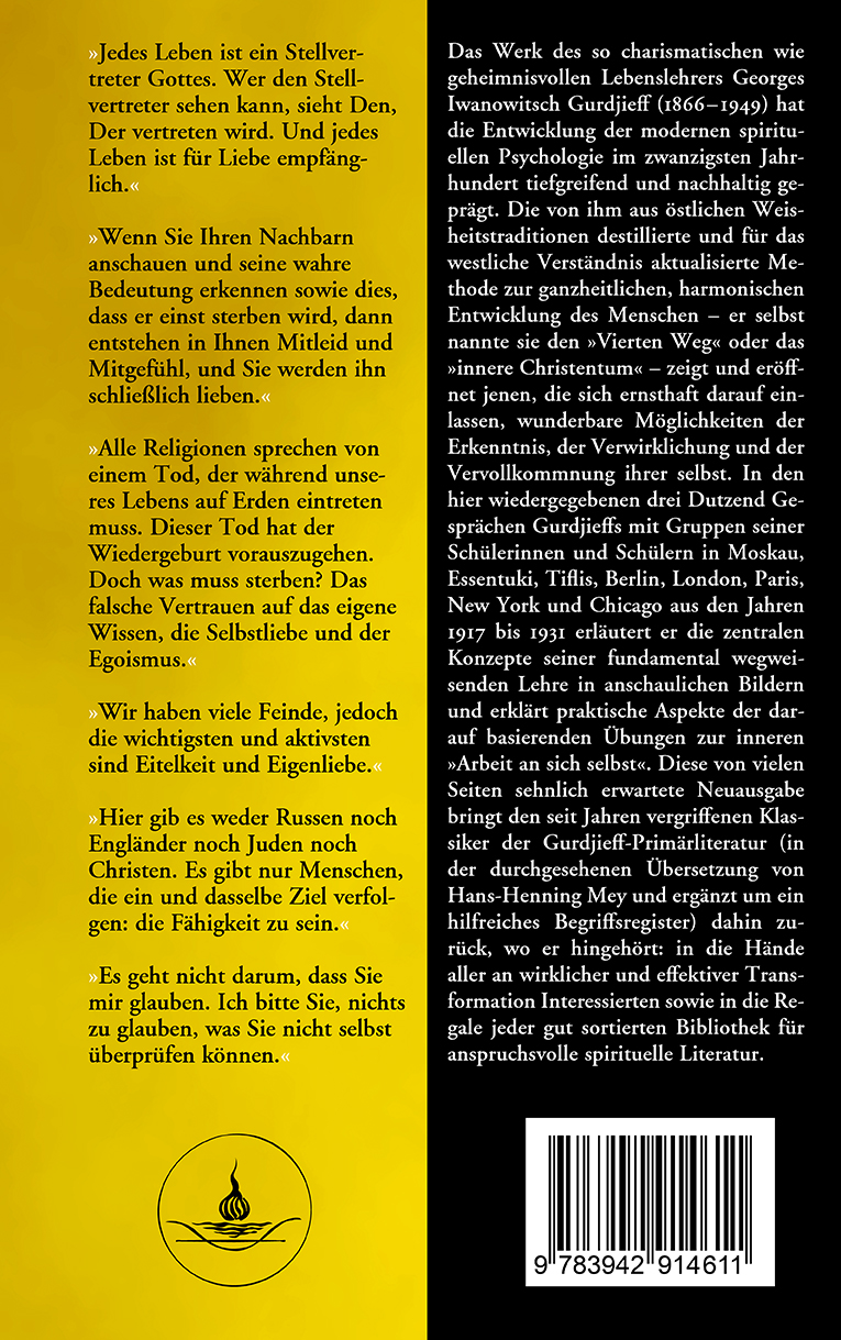 Diese von vielen Seiten sehnlich erwartete Neuausgabe bringt den seit Jahren vergriffenen Klassiker der Gurdjieff-Primärliteratur (in der durchgesehenen Übersetzung von Hans-Henning Mey und ergänzt um ein hilfreiches Begriffsregister) dahin zurück, wo er hingehört: in die Hände aller an wirklicher und effektiver Transformation Interessierten sowie in die Regale jeder gut sortierten Bibliothek für anspruchsvolle spirituelle Literatur.