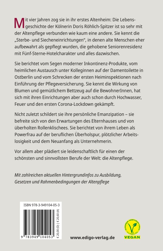 Mit vier Jahren zog sie in ihr erstes Altenheim: Die Lebensgeschichte der Kölnerin Doris Röhlich-Spitzer ist so sehr mit der Altenpflege verbunden wie kaum eine andere. Sie kennt die "Sterbe- und Siecheneinrichtungen", die gehobene Seniorenresidenz mit Fünf-Sterne-Hotelcharakter und alles dazwischen. Lebhaft erzählt sie vom Aufwachsen zwischen Ordensschwestern und Pflegebedürftigen und vom Hereinwachsen in den anspruchsvollen Beruf der Altenpflege. Vor allem aber erzählt sie von Herausforderungen: Doris Röhlich-Spitzer musste mit den Schicksalen der Pflegebedürftigen umgehen lernen sowie in festgefahrenen Hierarchien um die Interessen ihrer SeniorInnen und MitarbeiterInnen kämpfen. Sie berichtet vom Segen moderner Inkontinenz-Produkte und vom Schrecken der Heiminspektionen. Mit ihren MitarbeiterInnen hat sie sich tapfer durch Hochwasser, Feuer und den ersten Corona-Lockdown gekämpft. Nicht zuletzt schildert sie auch ihre persönliche Emanzipation - sie befreite sich von den Erwartungen des Elternhauses und von überholten Rollenklischees. Sie nimmt die LeserInnen mit in ihr Leben als Powerfrau auf der beruflichen Überholspur, in die plötzlicher Arbeitslosigkeit und den Neuanfang als Beraterin und Interimsmanagerin. Ihre Geschichte gewährt umfassende Einblicke in die Pflegelandschaft, die sie kritisch, aber konstruktiv kommentiert. Sie fordert Bedingungen, die eine menschliche, ganzheitliche Pflege ermöglichen. Sie möchte AltenpflegerInnen Mut machen, trotz schwieriger Umstände empathisch zu bleiben und die Aufgaben täglich neu anzunehmen. Sie wirbt mit viel Herzenswärme für ihren Beruf und möchte Neu- und QuereinsteigerInnen dafür begeistern. Angehörige und Interessierte erhalten einen Blick hinter die Kulissen einer Pflegeeinrichtung. Die Biographie wird ergänzt durch zahlreiche Fotos und aktuelle Hintergrundinfos zu Ausbildung, Pflegeversicherung, Pflegegraden, Gesetzen und Rahmenbedingungen der Pflege.