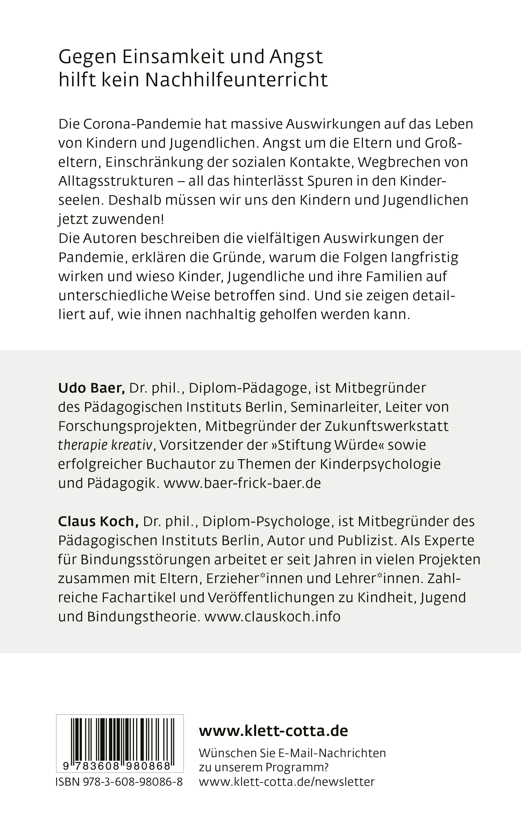 Die Corona-Pandemie hat massive Auswirkungen auf das Leben von Kindern und Jugendlichen und hinterlässt Spuren in ihren Seelen. Deshalb müssen wir uns ihnen jetzt zuwenden! Die Autoren beschreiben die vielfältigen Auswirkungen der Pandemie, sie erklären, warum die Folgen langfristig wirken und wieso Kinder, Jugendliche und ihre Familien auf unterschiedliche Weise betroffen sind. Und sie zeigen auf, wie ihnen nachhaltig geholfen werden kann. Konkret und praktisch, mit zahlreichen Fallbeispielen.