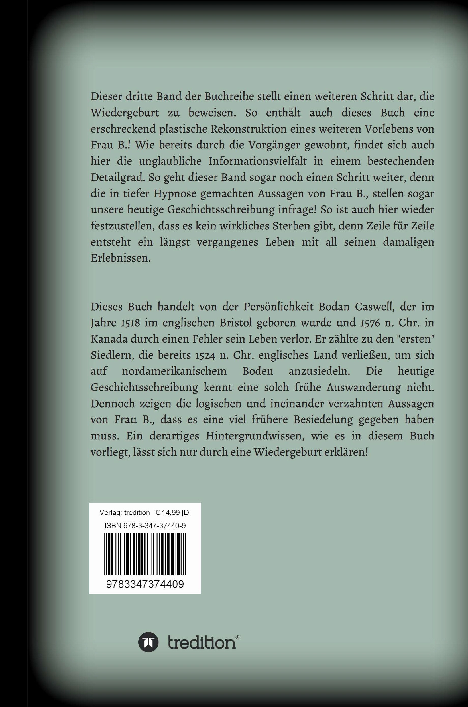 Dieser dritte Band der Buchreihe stellt einen weiteren Schritt dar, die Wiedergeburt zu beweisen. So enthält auch dieses Buch eine erschreckend plastische Rekonstruktion eines weiteren Vorlebens von Frau B.! Wie bereits durch die Vorgänger gewohnt, findet sich auch hier die unglaubliche Informationsvielfalt in einem bestechenden Detailgrad. So geht dieser Band sogar noch einen Schritt weiter, denn die in tiefer Hypnose gemachten Aussagen von Frau B., stellen sogar unsere heutige Geschichtsschreibung infrage! So ist auch hier wieder festzustellen, dass es kein wirkliches Sterben gibt, denn Zeile für Zeile entsteht ein längst vergangenes Leben mit all seinen damaligen Erlebnissen. Dieses Buch handelt von der Persönlichkeit Bodan Caswell, der im Jahre 1518 im englischen Bristol geboren wurde und 1576 n. Chr. in Kanada durch einen Fehler sein Leben verlor. Er zählte zu den "ersten" Siedlern, die bereits 1524 n. Chr. englisches Land verließen, um sich auf nordamerikanischem Boden anzusiedeln. Die heutige Geschichtsschreibung kennt eine solch frühe Auswanderung nicht. Dennoch zeigen die logischen und ineinander verzahnten Aussagen von Frau B., dass es eine viel frühere Besiedelung gegeben haben muss. Ein derartiges Hintergrundwissen, wie es in diesem Buch vorliegt, lässt sich nur durch eine Wiedergeburt erklären!
