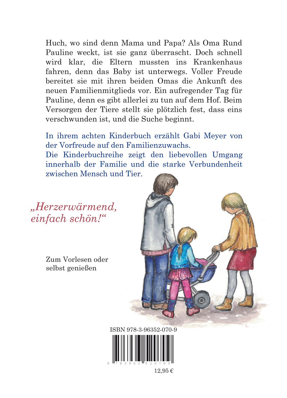 Huch, wo sind denn Mama und Papa? Als Oma Rund Pauline weckt, ist sie ganz überrascht. Doch schnell wird klar, die Eltern mussten ins Krankenhaus fahren, denn das Baby ist unterwegs. Voller Freude bereitet sie mit ihren beiden Omas die Ankunft des neuen Familienmitglieds vor. Ein aufregender Tag für Pauline, denn es gibt allerlei zu tun auf dem Hof. Beim Versorgen der Tiere stellt sie plötzlich fest, dass eins verschwunden ist, und die Suche beginnt. In ihrem achten Kinderbuch erzählt Gabi Meyer von der Vorfreude auf den Familienzuwachs. Die Kinderbuchreihe zeigt den liebevollen Umgang innerhalb der Familie und die starke Verbundenheit zwischen Mensch und Tier. "Herzerwärmend, einfach schön!" Zum Vorlesen oder selbst genießen