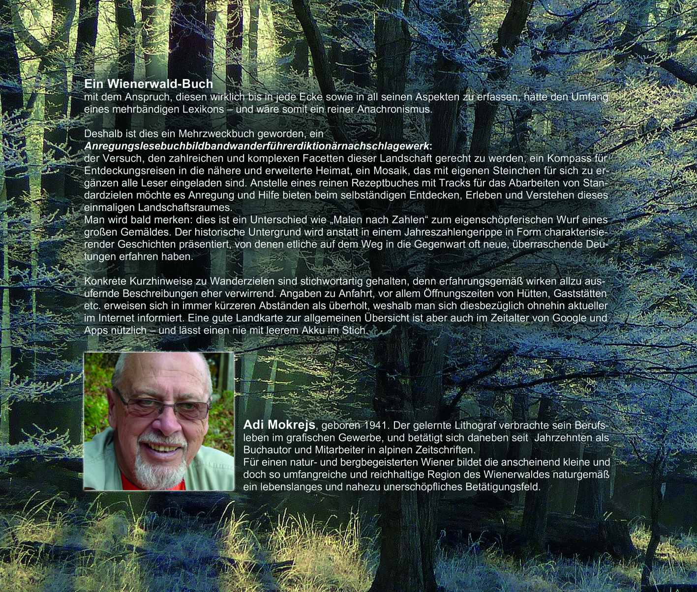 Adi Mokrejs, geboren 1941. Der gelernte Lithograf verbrachte sein Berufsleben im grafischen Gewerbe, und betätigt sich daneben seit Jahrzehnten als Buchautor und Mitarbeiter in alpinen Zeitschriften. Für einen natur- und bergbegeisterten Wiener bildet die anscheinend kleine und doch so umfangreiche und reichhaltige Region des Wienerwaldes naturgemäß ein lebenslanges und nahezu unerschöpfliches Betätigungsfeld.
