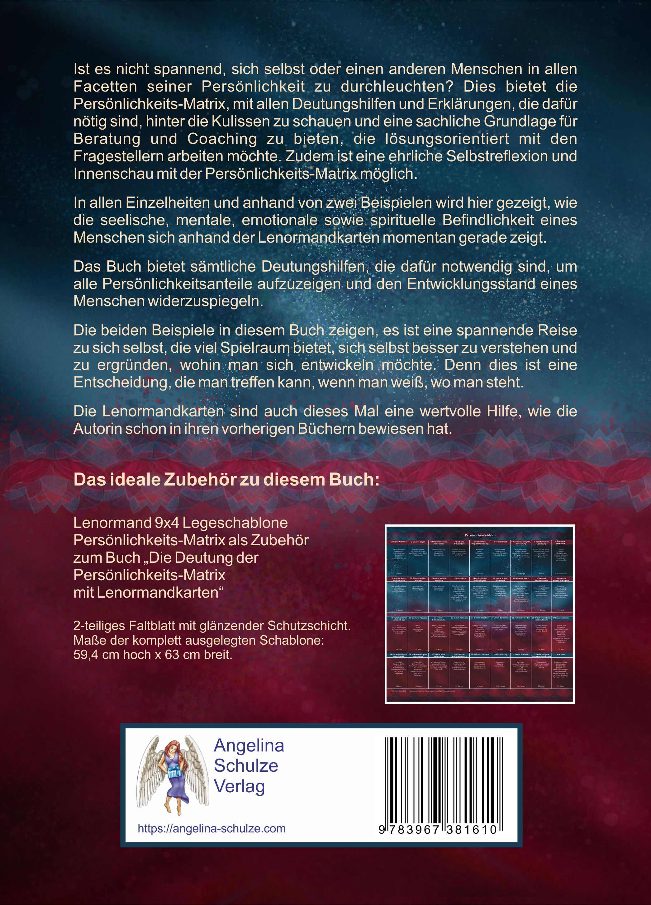 In ihrem vierten Buch zeigt die Autorin ein Abbild des Menschen mit Hilfe der Lenormandkarten, das einem die Grundlage bietet, für sich selbst oder andere Menschen eine Persönlichkeitsanalyse vorzunehmen.