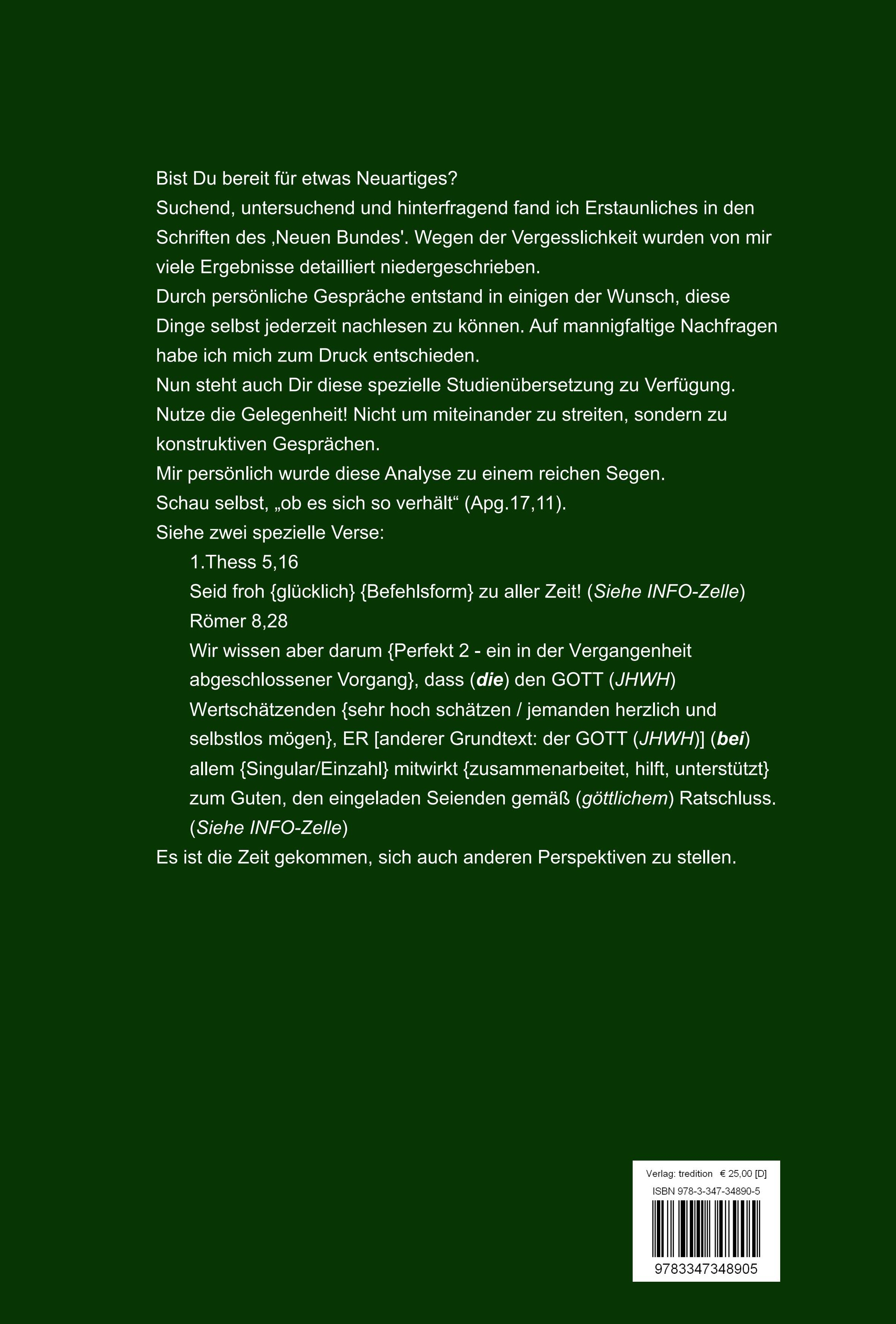 Bist Du bereit für etwas Neuartiges? Suchend, untersuchend und hinterfragend fand ich Erstaunliches in den Schriften des 'Neuen Bundes'. Wegen der Vergesslichkeit wurden von mir viele Ergebnisse detailliert niedergeschrieben. Durch persönliche Gespräche entstand in einigen der Wunsch, diese Dinge selbst jederzeit nachlesen zu können. Auf mannigfaltige Nachfragen habe ich mich zum Druck entschieden. Nun steht auch Dir diese spezielle Studienübersetzung zu Verfügung. Nutze die Gelegenheit! Nicht um miteinander zu streiten, sondern zu konstruktiven Gesprächen. Mir persönlich wurde diese Analyse zu einem reichen Segen. Schau selbst, "ob es sich so verhält" (Apg.17,11). Siehe zwei spezielle Verse: 1.Thess 5,16 Seid froh (glücklich) (Befehlsform) zu aller Zeit! (Siehe INFO-Zelle) Römer 8,28 Wir wissen aber darum (ß Perfekt 2 - ein in der Vergangenheit abgeschlossener Vorgang), dass (die) den GOTT (JHWH) Wertschätzenden (sehr hoch schätzen / jemanden herzlich und selbstlos mögen), ER [anderer Grundtext: der GOTT (JHWH)] (bei) allem (Singular/Einzahl) mitwirkt (zusammenarbeitet, hilft, unterstützt) zum Guten, den eingeladen Seienden gemäß (göttlichem) Ratschluss. (Siehe INFO-Zelle) Es ist die Zeit gekommen, sich auch anderen Perspektiven zu stellen.
