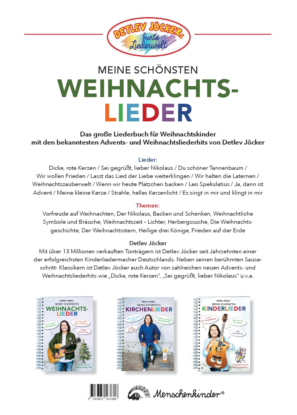 Das große Liederbuch für Weihnachtskinder Detlev Jöcker gehört mit über 17 Millionen verkauften Kinderalben und Liederbüchern seit Jahrzehnten zu den erfolgreichsten und meistgesungenen Kinderliedermachern Deutschlands. Er hat für dieses Buch 80 seiner bekanntesten und beliebtesten Advents- und Weihnachtshits zusammengestellt. Mit Klassikern wie DICKE ROTE KERZEN, SEI GEGRÜSST, LIEBER NIKOLAUS, DU SCHÖNER TANNENBAUM, LASST DAS LIED DER LIEBE WEITERKLINGEN, die in Kindergärten, Schulen, bei Weihnachtsgottesdiensten und Zuhause begeistert gesungen und gespielt werden. Die Lieder besingen die Vorfreude auf Weihnachten, das Nikolausfest und den Heiligen Abend, aber sie erklären auch weihnachtliche Bräuche und Symbole. Für Kindergarten, Schule, Kirchengemeinde, Musikpädagogen und Zuhause. Geeignet für Kinder ab 4 Jahren. INHALT: Das Liederbuch enthält alle Noten, Liedtexte, leicht nachspielbare Gitarrengriffe. PRAXISFREUNDLICH: Bei der Spiralbindung kann man das Buch flachliegend auf einen Tisch oder Notenständer legen, so dass es dabei offen liegen bleibt. LIEDER: Dicke, rote Kerzen / Sei gegrüßt, lieber Nikolaus / Du schöner Tannenbaum / Oh weh, noch immer liegt kein Schnee / Wir wollen Frieden / Lasst das Lied der Liebe weitersingen / Wir halten die Laternen / WeihnachtsZauberwelt / Wenn wir heute Plätzchen backen / Leo Spekulatius / Ja, dann ist Advent / Meine kleine Kerze / Strahle helles Kerzenlicht / Es singt in mir und klingt in mir u.v.a. THEMEN: Bald ist Weihnachten, Der Nikolaus kommt, Backen und Schenken, Weihnachtliche Symbole und Bräuche, Weihnachtszeit-Lichterzeit, Herbergssuche, Die Weihnachtsgeschichte, Der Weihnachtsstern, Heilige Drei Könige, Frieden auf Erdegssuche, Die Weihnachtsgeschichte, Der Weihnachtsstern, Heilige Drei Könige, Frieden auf Erde