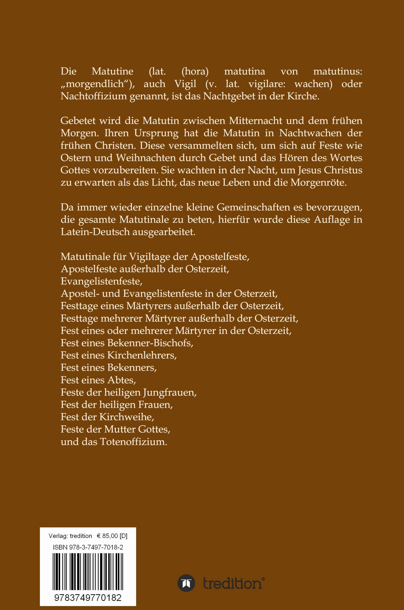 Die Matutine (lat. (hora) matutina von matutinus: "morgendlich"), auch Vigil (v. lat. vigilare: wachen) oder Nachtoffizium genannt, ist das Nachtgebet in der Kirche.Gebetet wird die Matutin zwischen Mitternacht und dem frühen Morgen. Ihren Ursprung hat die Matutin in Nachtwachen der frühen Christen. Diese versammelten sich, um sich auf Feste wie Ostern und Weihnachten durch Gebet und das Hören des Wortes Gottes vorzubereiten. Sie wachten in der Nacht, um Jesus Christus zu erwarten als das Licht, das neue Leben und die Morgenröte.Da immer wieder einzelne kleine Gemeinschaften es bevorzugen, die gesamte Matutinale zu beten, hierfür wurde diese Auflage in Latein-Deutsch ausgearbeitet.Matutinale II. Für die gemeinsamen Teile der Heiligenfeste, der Kirchweihe und des Totenoffiziums, Gebete für Vigiltagen der Apostelfeste,Apostelfesten außerhalb der Osterzeit,Evangelistenfesten,Apostel- und Evangelistenfesten in der Osterzeit,Festtag eines Martyrers außerhalb der Osterzeit,Festtag mehrerer Martyrer außerhalb der Osterzeit,Fest eines oder mehrerer Martyrer in der Osterzeit,Fest eines Bekenner-Bischofs,Fest eines Kirchenlehrers,Fest eines Bekenners,Fest eines Abtes,Feste der heiligen Jungfrauen,Fest einer heiligen Frau,Fest der Kirchweihe,Fest der Mutter Gottes,Totenoffizium.
