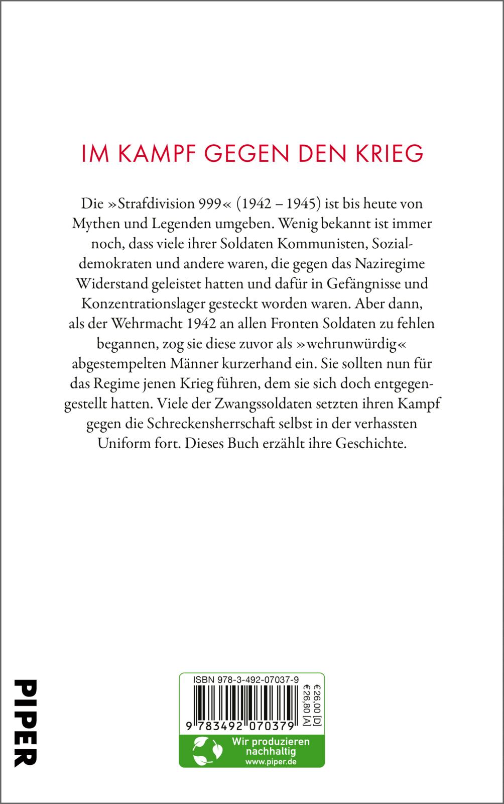 Vorwort Ich weiß nicht, wie ich aus diesem Krieg kommen werde. Es wäre zu irrsinnig, wenn ich für den Wahnsinn Hitlers sterben müsste. Es müssen Menschen übrig bleiben, die … gegen das Furchtbare, das mit dem Namen Hitler über die Welt kam, kämpften. Die vor 1933 warnten und aufrüttelten. Die es nach 1933 illegal fortsetzten. Wenn auch mit der Hilflosigkeit von Zwergen, die vor einen rollenden Panzer Kieselsteine werfen, um ihn aufzuhalten. Die trotzdem nicht aufhörten mit den Kieselsteinen … Das schrieb ein heute fast vergessener Schriftsteller, Emil Rudolf („Erge“) Greulich, im April 1943; er hatte gerade um Haaresbreite einen Angriff britischer Jagdflugzeuge auf die Transportmaschine überlebt, die ihn und seine Kameraden an die Tunesienfront bringen sollte. All diese nicht mehr ganz jungen Männer an Bord trugen die Uniform der deutschen Wehrmacht. Und sie alle hatten nicht freiwillig in dem Flugzeug gesessen, wie sie auch höchst unfreiwillig zu den Soldaten gekommen waren. Ihre Truppe, die 1942 gegründete Strafdivision 999, bestand zu erheblichen Teilen aus Widerstandskämpfern gegen den Nationalsozialismus: Kommunisten und Sozialdemokraten vor allem, aber auch unabhängige Sozialisten, tiefreligiöse Ernste Bibelforscher und bürgerliche Nonkonformisten. Sie hatten Jahre in den Zuchthäusern und Konzentrationslagern der Nazis abgesessen oder waren gar direkt von dort eingezogen worden. Die NS-Diktatur hatte ihre eigenen Todfeinde bewaffnet. Und welch eine Geschichte das ist: Auf diese Weise wurden Tausende von Widerstandskämpfern zu Soldaten des Terrorsystems, dessen Uniform sie trugen. Bis heute sind das Schicksal dieser Strafsoldaten, ihr Mut und ihr Eintreten gegen den Zivilisationsbruch der Naziherrschaft erstaunlich wenig bekannt. Diese Menschen und ihr Kampf gegen die Tyrannei und für die Freiheit, den viele von ihnen noch in Uniform wo immer möglich fortsetzten, sind das Thema dieses Buches. In der Strafdivision 999 mussten insgesamt etwa 28 000 Männer dienen. Als Sträflinge hatten sie jahrelang als „Wehrunwürdige“ gegolten, für nicht wert betrachtet, in der Wehrmacht zu dienen, wie ihnen ein amtlicher blauer Schein bestätigte. 1942 aber, als der Krieg, den Deutschland über die Welt gebracht hatte, tatsächlich zum Weltkrieg geworden war, Hunderttausende gefallen waren und den deutschen Armeen immer mehr Soldaten fehlten, berief sie sogar jene Männer, die sie zuvor gar nicht hatte haben wollen, in eine eilig geschaffene Strafdivision ein. Gut ein Drittel dieser Soldaten hatten als „Politische“ Widerstand gegen das Regime gewagt. Zu den „999ern“ gehört hatten ein Vizekanzler der Bundesrepublik (Egon Franke, SPD), ein von der Holocaust-Gedenkstätte Yad Vashem als „Gerechter unter den Völkern“ ausgezeichneter Retter von verfolgten Juden (Michael „Mike“ Jovy) sowie der von seinem Schüler Jürgen Habermas als „Partisanenprofessor“ verehrte Philosoph und Mitbegründer der „Marburger Schule“ Wolfgang Abendroth. In der DDR gab es etliche Funktionsträger aus Politik und Kultur, die in der Strafdivision gedient hatten: unter ihnen Emil Rudolf Greulich, der Volksmarine-Admiral Erwin Bartz und, als wohl Bekanntester, Karl-Eduard von Schnitzler, jahrzehntelang Moderator der SED-Propagandasendung „Der Schwarze Kanal“. Und da waren, in beiden Teilen Deutschlands, so viele andere, deren Namen lange vergessen sind; auch deshalb, weil jenseits der Militäropposition des 20. Juli 1944 und ähnlicher Kreise Resistenz und Widerstand einfacher Soldaten jahrzehntelang ein Tabuthema gewesen sind. So lange bestimmte der Mythos von der „sauberen Wehrmacht“ als Lebenslüge von nicht unerheblichen Teilen der Kriegsteilnehmer das öffentliche Bewusstsein in der Bundesrepublik, dass das Verhalten von Deserteuren, Fahnenflüchtigen und ähnlichen Verweigerern, die nicht im Vernichtungskrieg hatten kämpfen wollen, „als Zeichen von Angst, Feigheit und Verrat gewertet wurde“, so der Zeithistoriker Wolfgang Benz. Und Ähnliches galt für die früheren Strafsoldaten, sofern man überhaupt etwas über sie wusste. Leider muss man es so hart sagen wie die Historiker Norbert Haase und Gerhard Paul, welche 1995, fünf Jahrzehnte nach Kriegsende, über die Opfer der Nazimilitärjustiz schrieben: Im Traditionsbild deutscher Volkstrauertage, in den unzähligen Regimentsgeschichten der Kriegervereine haben jene, die sich auf die ein oder andere Weise dem Kriegsdienst in den nationalsozialistischen Angriffskriegen entzogen und dafür verfolgt wurden, keinen Platz. Die deutsche Gesellschaft hat in den zurückliegenden Jahrzehnten den Deserteuren, Verweigerern und „Zersetzern“ Respekt und Anerkennung versagt. Dabei hätte die Bundesrepublik stolz auf sie sein können – zumindest dem eigenen Anspruch nach. In scharfer theoretischer Abgrenzung zur Wehrmacht gab die Bundeswehr zwar das Leitbild des Staatsbürgers in Uniform aus. Doch jene, die noch als Hitlers Zwangssoldaten im Herzen verantwortungsbewusste Staatsbürger geblieben waren, werden bis heute kaum gewürdigt. Fast während der gesamten vier Jahrzehnte der deutschen Teilung diente die Erinnerung an den Widerstand gegen den Nationalsozialismus auch dazu, den jeweiligen deutschen Staat historisch zu legitimieren. Unweigerlich führte dies hier wie dort zu einer Verengung des Widerstandsbildes auf jene Gruppen, die sich am besten dafür eigneten: im Osten natürlich auf die Kommunisten, in der Bundesrepublik lange Zeit auf die Weiße Rose, den mit Namen wie August Graf Galen und Dietrich Bonhoeffer verbundenen kirchlichen Widerstand und die Männer des 20. Juli 1944, also bürgerliche Jugend, christliche Identität und das Militär – was die neue Bundeswehr nicht im Geringsten daran hinderte, ihre Kasernen sehr lange Zeit lieber nach Hitlers Heerführern und Ritterkreuzträgern zu benennen. Freilich musste auch in der DDR ein früherer 999er wie Emil Rudolf Greulich erfahren, dass wir