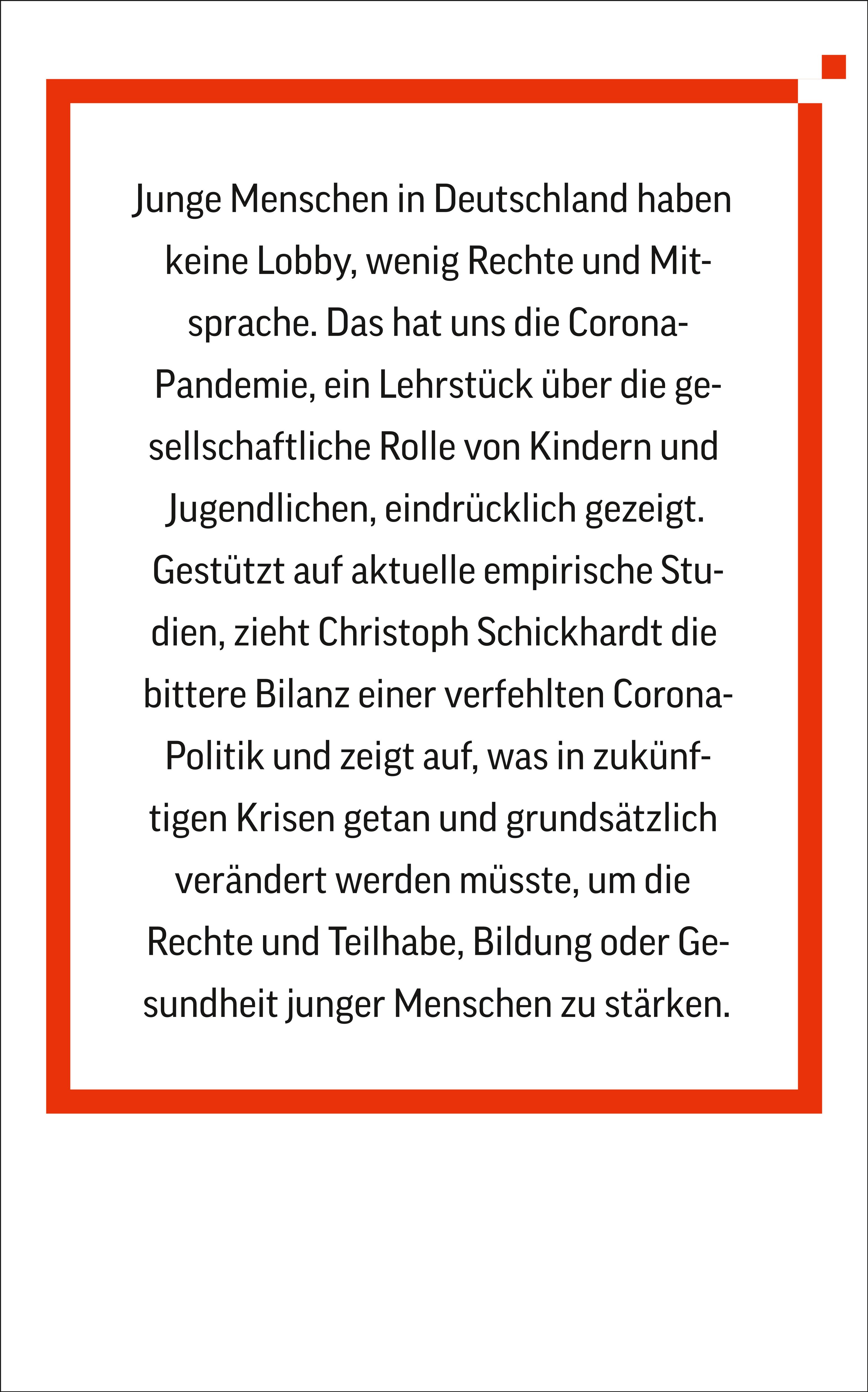 | Schlagworte | 3G-Regel • AHA-Regeln • aktuelles Buch • Armin Laschet • Ausgangsbeschränkung • benachteiligte Kinder • Benjamin Fauth • Besuchsverbote • Bildungsdesaster • Bildungspolitik • bücher neuerscheinungen • Bundesgesundheitsminister • Coronakrise • Corona-Krise • Coronaleugner • Corona-Maßnahmen • Corona-Pandemie • Coronapolitik • Corona-Politik • Corona-Protokolle • Corona und Kinder • Covid 19 • Covid-19 • Deutscher Ethikrat • Distanzunterricht • Eva Winkler • Fallzahlen • FFP2-Masken • Generation Corona • hochskaliert • Homeschooling • Impfpolitik • Impfung • Infektionsschutz • Jens Spahn • Jörg Maywald • Karl Lauterbach • Katarina Weilert • katastrophales Krisenmanagement • Kinderethik • Kinderrechte • Kinderschutz • Kindeswohl-Gefährdungen • Kita-Schließung • Lagebericht • lockdown • Lothar Wieler • Maskenpflicht • Ministerpräsidentenkonferenz • Multipolar-Klage • NCT Heidelberg • Neuerscheinungen • neues Buch • Pandemie • Pandemie-Lessons to be Learned • PCR-Test • Peter Küspert • Recht auf Bildung • Reformvorschläge • Regelbetrieb • Risikobewertung • Risikoeinschätzung • #RKIFiles • Robert-Koch-Instituts (RKI) • SARS-CoV-2 • Sars-CoV-2-Virus • Schnelltest • schulen geschlossen • Schulpolitik • Schulschließung • Selbsttest • ST 5265 • ST5265 • Ständige Impfkommission (Stiko) • suhrkamp taschenbuch 5265 • Translationale Medizinethik |