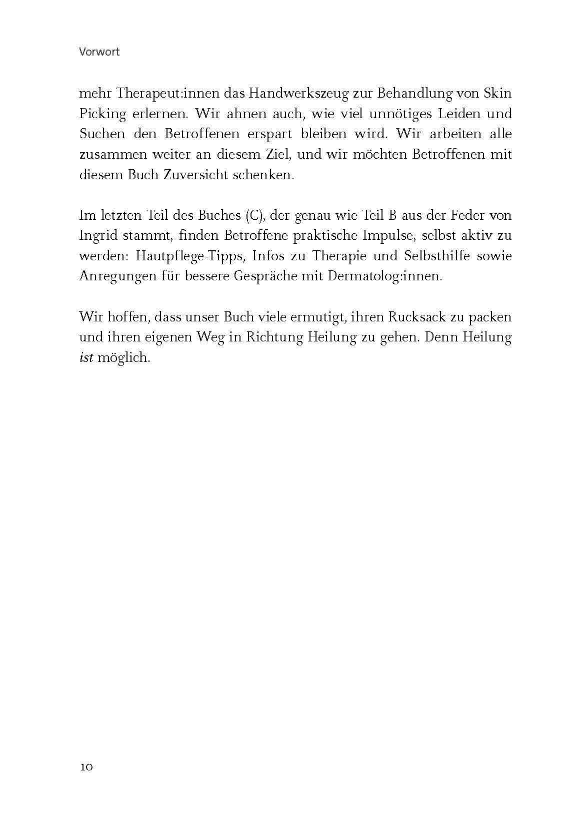 Ingrid Bäumer hat 2010 in Köln die erste deutschsprachige Selbsthilfegruppe für Skin Picker gegründet. Sie hat wesentlich dazu beigetragen, im deutschsprachigen Raum ein Bewusstsein für Skin Picking zu schaffen. Ihre Arbeit wurde zum Vorbild für Selbsthilfegruppen in Deutschland, Österreich und der Schweiz. Berufl ich arbeitet Ingrid Bäumer mit Sprache, unter anderem als Autorin und Redakteurin.