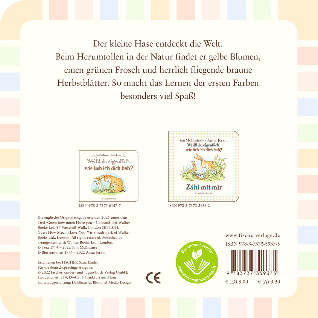 | Schlagworte | Buch für Baby Kleinkind Kindergartenkind • Buggy-Buch Baby-Buch über Farben • erste Farben • Farben • Farben Lernen • Farben lernen Buch • Geschenk erster zweiter dritter Geburtstag • günstiges Geschenk für Klein-Kind • Hasen • Kinder-Buch Farben lernen • Natur • Papp-Bilder-Buch ab 2 Jahre • Pappebuch für Mädchen Jungen ab 2 Jahren • sprechen lernen kinder • weißt du eigentlich wie lieb ich dich hab • Weißt du eigentlich, wie lieb ich dich hab? |