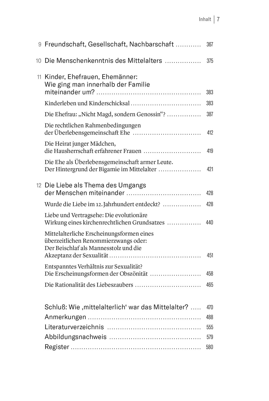 Einleitung . . . . . . . . . . . . . . . . . . . . . . . . . . . . . . . . . . . . . . . . . . . . . . . . . . . . . . . . . . 9Erster Teil:Natürliches Lebensumfeld . . . . . . . . . . . . . . . . . . . . . . . . . . 271 Das Klima und die Sorge um frische Luft . . . . . . . . . . . . . . . . . 282 Der Mensch und die Erde: Das Beispiel des Waldes . . . . . . . . . . . . . . . . . . . . . . . . . . . . . . . . . . . . . . . 563 Das Wasser: Voraussetzung des Lebens und Grundlage der Kultur . . . . . . . . . . . . . . . . . . . . . . . . . . . . . . . . . . . . . 1114 Der unmittelbare Umgang mit Gottes Schöpfung: Menschen und Tiere . . . . . . . . . . . . . . . . . . . . . . . . . . . . 1905 Umrisse des Natur- und Umweltbewußtseins . . . . . . . . . . 214Zweiter Teil:Menschliches Miteinander . . . . . . . . . . . . . . . . . . . . . . . . . 2611 "Deutsch reden": Grundlagen der Kommunikation . . . . . . . . . . . . . . . . . . . . . . . . . . . . 2622 Umgangsformen: Der Alltag hinter der höfischen Etikette . . . . . . . . . . . . . . . . . . . . . . . . . . . . . . . . . 2733 Direktheit: Wie beurteilen die Menschen einander? . . . . . . . . . . . . . . . . . . . . . . . . . . . . . . . . . . . . . . 2944 Die Beschimpfung des Mitmenschen . . . . . . . . . . . . . . . . . . . . . 3085 Flüche und Segen: Gott und seine Heiligen im alltäglichen Umgang . . . . . . . . . . . . . . . . . . . 3236 Gefährliche Direktheit: Jähzorn und spontane Gewalt . . . . . . . . . . . . . . . . . . . . . . . . . . . . . . . 3367 Mitleid, die Grenzen des Mitgefühls und die Schadenfreude . . . . . . . . . . . . . . . . . . . . . . . . . . . . . . . . . . . . . . . . 3518 Die Grundlage des Umgangs: Mißtrauen und Vertrauen . . . . . . . . . . . . . . . . . . . . . . . . . . . . . . . . . . . . . . 3629 Freundschaft, Gesellschaft, Nachbarschaft . . . . . . . . . . . . 36710 Die Menschenkenntnis des Mittelalters . . . . . . . . . . . . . . . . . . 37511 Kinder, Ehefrauen, Ehemänner: Wie ging man innerhalb der Familie miteinander um? . . . . . . . . . . . . . . . . . . . . . . . . . . . . . . . . . . . . . . . . . . . . . . . . . 38312 Die Liebe als Thema des Umgangs der Menschen miteinander . . . . . . . . . . . . . . . . . . . . . . . . . . . . . . . . . . . 428Schluß: Wie 'mittelalterlich' war das Mittelalter? . . . . . . 470Anmerkungen . . . . . . . . . . . . . . . . . . . . . . . . . . . . . . . . . . . . . . . . . . . . . . . . . . . . . 488Literaturverzeichnis . . . . . . . . . . . . . . . . . . . . . . . . . . . . . . . . . . . . . . . . . . . . . 555Abbildungsnachweis . . . . . . . . . . . . . . . . . . . . . . . . . . . . . . . . . . . . . . . . . . . . 579Register . . . . . . . . . . . . . . . . . . . . . . . . . . . . . . . . . . . . . . . . . . . . . . . . . . . . . . . . . . . . . 580