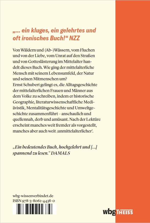 Von Wäldern und (Ab)Wässern, vom Fluchen und von der Liebe, vom Unrat auf den Straßen und von Gotteslästerung im Mittelalter handelt dieses Buch. Diese scheinbar weit auseinander liegenden Themen werden von der Frage geleitet, wie der mittelalterliche Mensch mit seinem Lebensumfeld, mit der Natur, mit seinen Mitmenschen umging. Wie konnte er in seiner Welt bestehen?Ernst Schubert gelingt es glänzend, die Alltagsgeschichte der mittelalterlichen Männer Frau aus dem Volke zu schreiben, indem er die spezialisierten Zweige der Geschichtsforschung - historische Geographie und literaturwissenschaftliche Mediävistik, Mentalitätsgeschichte und Umweltgeschichte - zusammenführt. Anschaulich und quellennah, derb und amüsant, kommt dem Leser nach der Lektüre manches weit fremder vor, als er es sich vorgestellt hatte, manches aber auch weit 'unmittelalterlicher'.