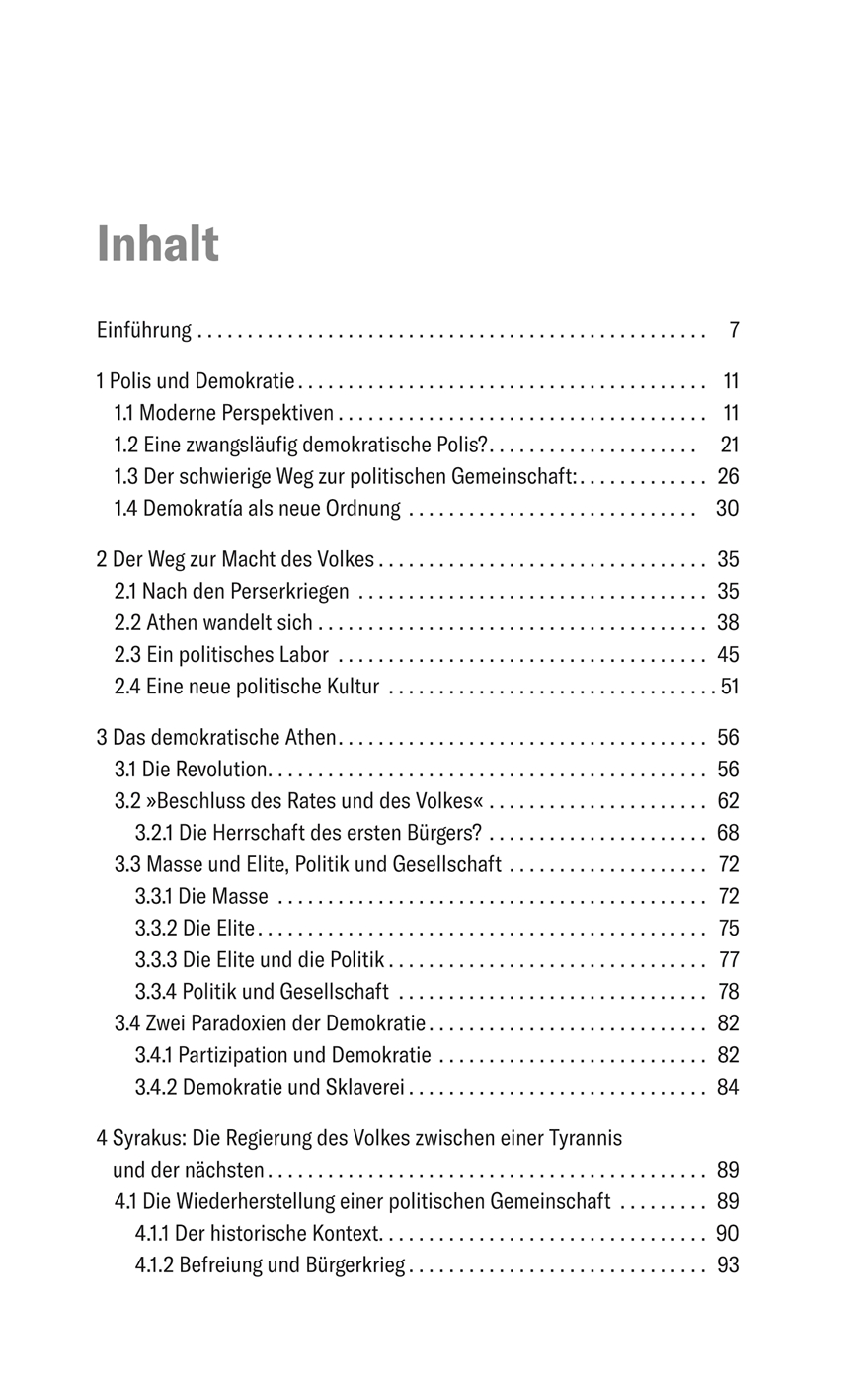Einführung 71 Polis und Demokratie111.1 Moderne Perspektiven 111.2 Eine zwangsläufig demokratische Polis? 211.3 Der schwierige Weg zur politischen Gemeinschaft:261.4 Demokratía als neue Ordnung 302 Der Weg zur Macht des Volkes 352.1 Nach den Perserkriegen 352.2 Athen wandelt sich 382.3 Ein politisches Labor 452.4 Eine neue politische Kultur 513 Das demokratische Athen 563.1 Die Revolution 563.2 »Beschluss des Rates und des Volkes« 623.2.1 Die Herrschaft des ersten Bürgers? 683.3 Masse und Elite, Politik und Gesellschaft 723.3.1 Die Masse 723.3.2 Die Elite 753.3.3 Die Elite und die Politik 773.3.4 Politik und Gesellschaft 783.4 Zwei Paradoxien der Demokratie 823.4.1 Partizipation und Demokratie 823.4.2 Demokratie und Sklaverei 844 Syrakus: Die Regierung des Volkes zwischen einer Tyrannis und der nächsten 894.1 Die Wiederherstellung einer politischen Gemeinschaft 894.1.1 Der historische Kontext 904.1.2 Befreiung und Bürgerkrieg 934.2 Politische Gleichheit und soziale Ungleichheit.964.3 Masse und Elite.Syrakus' Ostrakismos als Instrument des Aufruhrs994.4 Ein nunmehr stabiles Regierungssystem? 1024.5 Das Wort hat ein Führer des Volkes 1044.6 Von der demokratischen Radikalisierung zu einer neuen Tyrannei1135 Kroton: Vom Charisma des Pythagoras zur Macht des Volkes .1155.1 Transformationen 1155.2 Die »väterliche Verfassung« und die pythagoreische Macht 1245.3 Auf dem Weg zur neuen Regierungsform.Von der Erinnerung zur Geschichte 1275.4 Volksführer, Bürgermacht und soziale Spannungen .1336 Thurioi: Eine athenische Demokratie in der Magna Graecia .1396.1 Eine neue Ära: Athen in der Magna Graecia1396.2 Die »Planstadt« das Experiment der Demokratie.1426.3 Politik und Gesellschaft: Die Oligarchen gegen die politische Ordnung 1517 Wandel und Stabilität: Das demokratische Tarent .1587.1 Eine koloniale Gesellschaft: Eliten, Territorium, Indigene1587.2 Krieg und politischer Wandel1647.3 Eine von einem Philosophen geführte Demokratie: Das Zeitalter des Archytas 1707.4 Die gute Nutzung des Reichtums: Politik und soziale Stabilität176Anhang.183Karte von Unteritalien und Sizilien184Zeittafel186Bibliografie189Register214