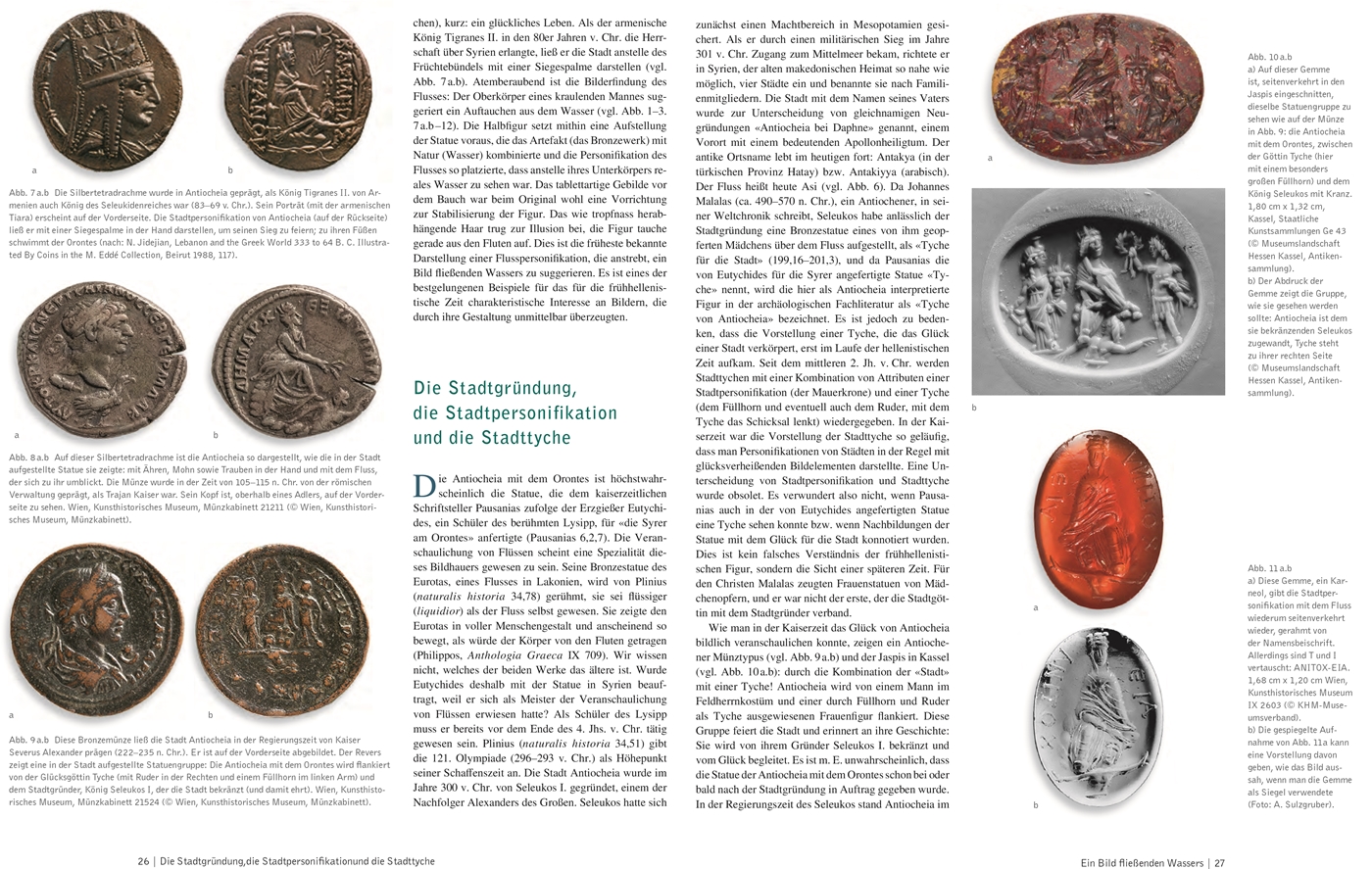 8 VORWORT9 KULTISCHE REINIGUNG UND DAS MEHREN VON ÜBERFLUSSReligiöse und rituelle Vorstellungen von Euphrat und Tigris im Alten Orientvon Theresa Blaschke15 DIE LEBHAFTE BIOGRAPHIE DES NILS - VON DER ANTIKE BIS HEUTEvon Robert Schiestl22 EIN BILD FLIESSENDEN WASSERSDer Orontes zu Füßen der Stadtpersonifikation von Antiocheiavon Marion Meyer30 EINE REISE IN DIE UNTERWELTStyx - Fluss des Grausensvon Achim Lichtenberger37 «ICH PREISE DEN GOTT MELES, DEN FLUSS, MEINEN RETTER ...»Epigraphische Weihungen an Flussgötter im kleinasiatischen Raumvon Stephan Lücke47 DER GEHÄUTETE FLUSSDer Marsyas im phrygischen Apameiavon Julian Wünsch53 «AM BESTEN ABER IST WASSER ...»Flüsse und Flusslandschaften im antiken Griechenlandvon Klaus Freitag62 SÖHNE DES OKEANOS UND DER TETHYSThrakische Flussgötter im Münzbildvon Ulrike Peter71 ASOPOS, SKAMANDROS UND BORYSTHENESFlussgötter als Stammväter von Königsgeschlechternvon Hülya Vidin79 FLÜSSE IN DEN DIONYSIAKA DES NONNOS VON PANOPOLISvon Nicole Kröll86 «SEI GEGRÜSST, DU RÜHMENSWERTE HERRIN MOSELLA!»Flussidyllen und Flussrealitäten in der Mosella des Ausoniusvon Saskia Kerschbaum97 VON FLÜSSEN, GÖTTERN UND EDLEN STEINENFlussgötter auf geschnittenen Steinenvon Carina Weiß105 AUCH ALLE WASSERWEGE FÜHRTEN NACH ROMFlüsse, wichtige Schifffahrtswege des Altertumsvon Hélène Roelens-Flouneau115 WENN DIE FLUT KOMMTRoms vorsorgender Umgang mit Hochwasser - Neue Forschungen zu einem alten Problemvon Jasmin Hettinger124 KAISER UND FLUSSDomitian und der Rhein - Trajan und die Donauvon Johannes Heinisch133 DER HEILIGE TIBER VERSCHLINGT DEN FALSCHEN ROMULUSKaiser Maxentius ertrinkt am 28. Oktober 312 n. Chr.von Kay Ehling141 DER ZWEIGEHÖRNTE FLUSSDer Rhein und die Römervon Ernst Baltrusch und Monika Schuol149 ALTE GÖTTER IN NEUEM GEWAND?Der Augustusbrunnen von Augsburg und seine Flüssevon Saskia Kerschbaum158 DER KAMPF ACHILLS MIT DEN FLÜSSEN - ODER: WIE MALT MAN HOMER?Zur Weimarer Preisaufgabe des Jahres 1801von Kay Ehling167 FRIEDE AUF FLÜSSENVon der Römerzeit zur Gegenwartvon Alexander Demandt176 AUTORINNEN UND AUTOREN