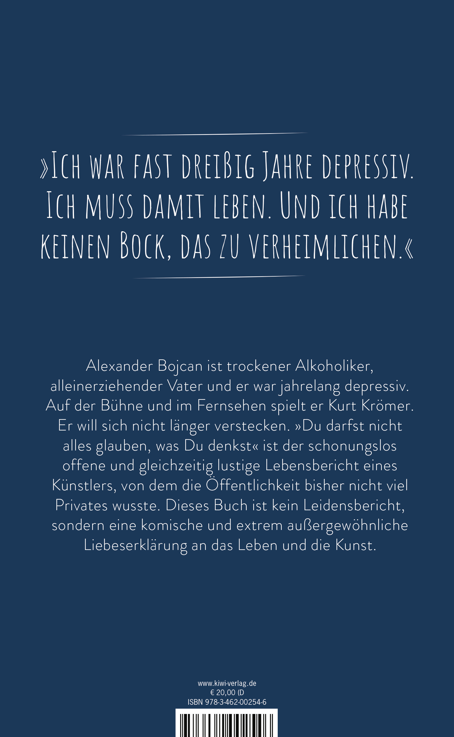 Alexander Bojcan ist 47 Jahre alt, trockener Alkoholiker, alleinerziehender Vater und er war jahrelang depressiv. Auf der Bühne und im Fernsehen spielt er Kurt Krömer. Er will sich nicht länger verstecken. »Du darfst nicht alles glauben, was Du denkst« ist der schonungslos offene und gleichzeitig lustige Lebensbericht eines Künstlers, von dem die Öffentlichkeit bisher nicht viel Privates wusste. Alexander Bojcan bricht ein Tabu und das tut er nicht um des Tabubrechens willen, sondern um Menschen zu helfen, die unter Depressionen leiden oder eine ähnliche jahrelange Ärzteodyssee hinter sich haben wie er selbst.