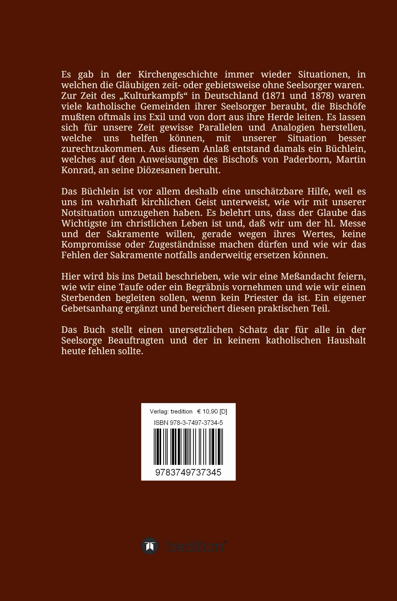 Es gab in der Kirchengeschichte immer wieder Situationen, in welchen die Gläubigen zeit- oder gebietsweise ohne Seelsorger waren. Zur Zeit des "Kulturkampfs" in Deutschland (1871 und 1878) waren viele katholische Gemeinden ihrer Seelsorger beraubt, die Bischöfe mußten oftmals ins Exil und von dort aus ihre Herde leiten. Es lassen sich für unsere Zeit gewisse Parallelen und Analogien herstellen, welche uns helfen können, mit unserer Situation besser zurechtzukommen. Aus diesem Anlaß entstand damals ein Büchlein, welches auf den Anweisungen des Bischofs von Paderborn, Martin Konrad, an seine Diözesanen beruht. Das Büchlein ist vor allem deshalb eine unschätzbare Hilfe, weil es uns im wahrhaft kirchlichen Geist unterweist, wie wir mit unserer Notsituation umzugehen haben. Es belehrt uns, dass der Glaube das Wichtigste im christlichen Leben ist und, daß wir um der hl. Messe und der Sakramente willen, gerade wegen ihres Wertes, keine Kompromisse oder Zugeständnisse machen dürfen und wie wir das Fehlen der Sakramente notfalls anderweitig ersetzen können. Hier wird bis ins Detail beschrieben, wie wir eine Meßandacht feiern, wie wir eine Taufe oder ein Begräbnis vornehmen und wie wir einen Sterbenden begleiten sollen, wenn kein Priester da ist. Ein eigener Gebetsanhang ergänzt und bereichert diesen praktischen Teil. Das Buch stellt einen unersetzlichen Schatz dar für alle in der Seelsorge Beauftragten und der in keinem katholischen Haushalt heute fehlen sollte.