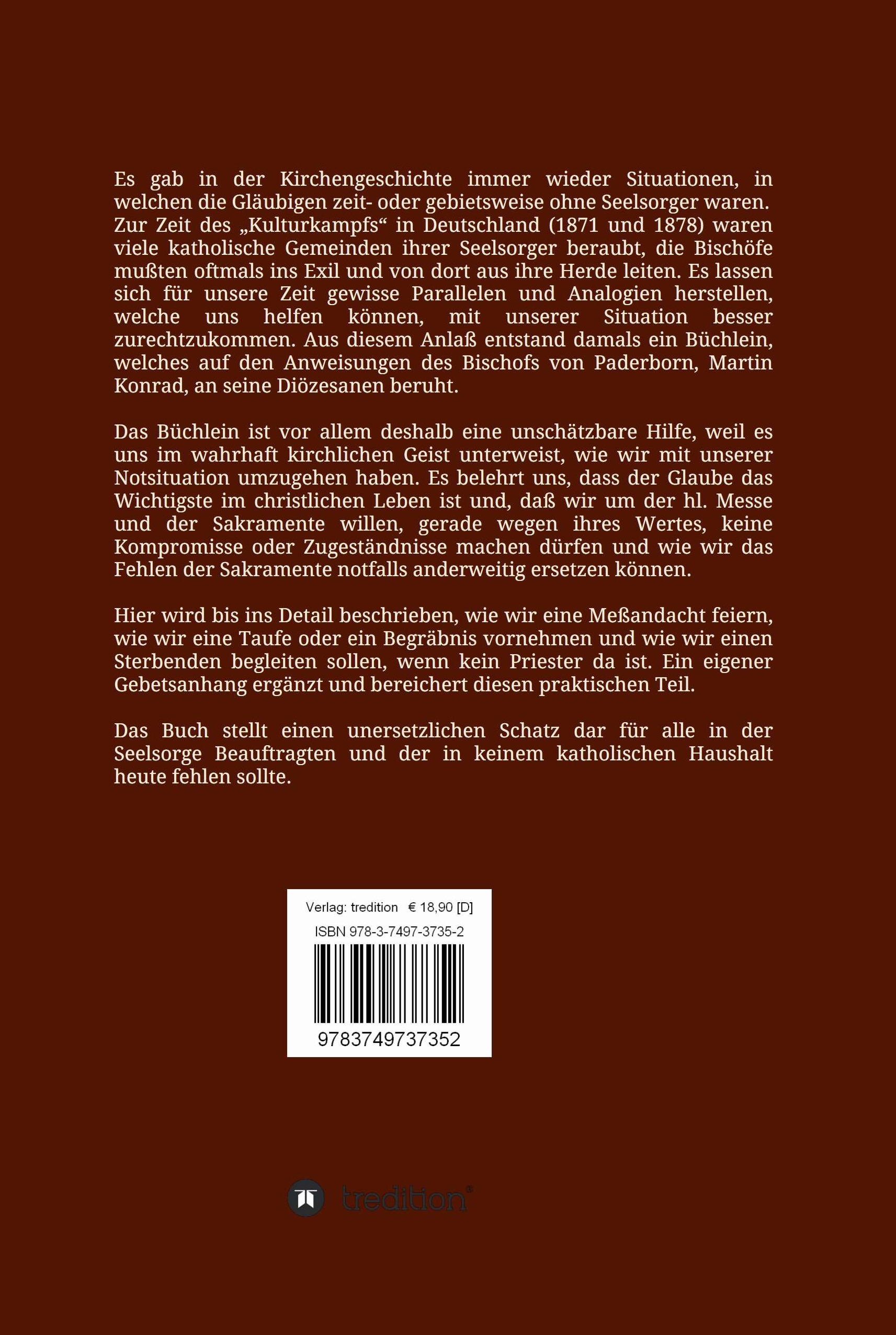 Es gab in der Kirchengeschichte immer wieder Situationen, in welchen die Gläubigen zeit- oder gebietsweise ohne Seelsorger waren. Zur Zeit des "Kulturkampfs" in Deutschland (1871 und 1878) waren viele katholische Gemeinden ihrer Seelsorger beraubt, die Bischöfe mußten oftmals ins Exil und von dort aus ihre Herde leiten. Es lassen sich für unsere Zeit gewisse Parallelen und Analogien herstellen, welche uns helfen können, mit unserer Situation besser zurechtzukommen. Aus diesem Anlaß entstand damals ein Büchlein, welches auf den Anweisungen des Bischofs von Paderborn, Martin Konrad, an seine Diözesanen beruht. Das Büchlein ist vor allem deshalb eine unschätzbare Hilfe, weil es uns im wahrhaft kirchlichen Geist unterweist, wie wir mit unserer Notsituation umzugehen haben. Es belehrt uns, dass der Glaube das Wichtigste im christlichen Leben ist und, daß wir um der hl. Messe und der Sakramente willen, gerade wegen ihres Wertes, keine Kompromisse oder Zugeständnisse machen dürfen und wie wir das Fehlen der Sakramente notfalls anderweitig ersetzen können. Hier wird bis ins Detail beschrieben, wie wir eine Meßandacht feiern, wie wir eine Taufe oder ein Begräbnis vornehmen und wie wir einen Sterbenden begleiten sollen, wenn kein Priester da ist. Ein eigener Gebetsanhang ergänzt und bereichert diesen praktischen Teil. Das Buch stellt einen unersetzlichen Schatz dar für alle in der Seelsorge Beauftragten und der in keinem katholischen Haushalt heute fehlen sollte.