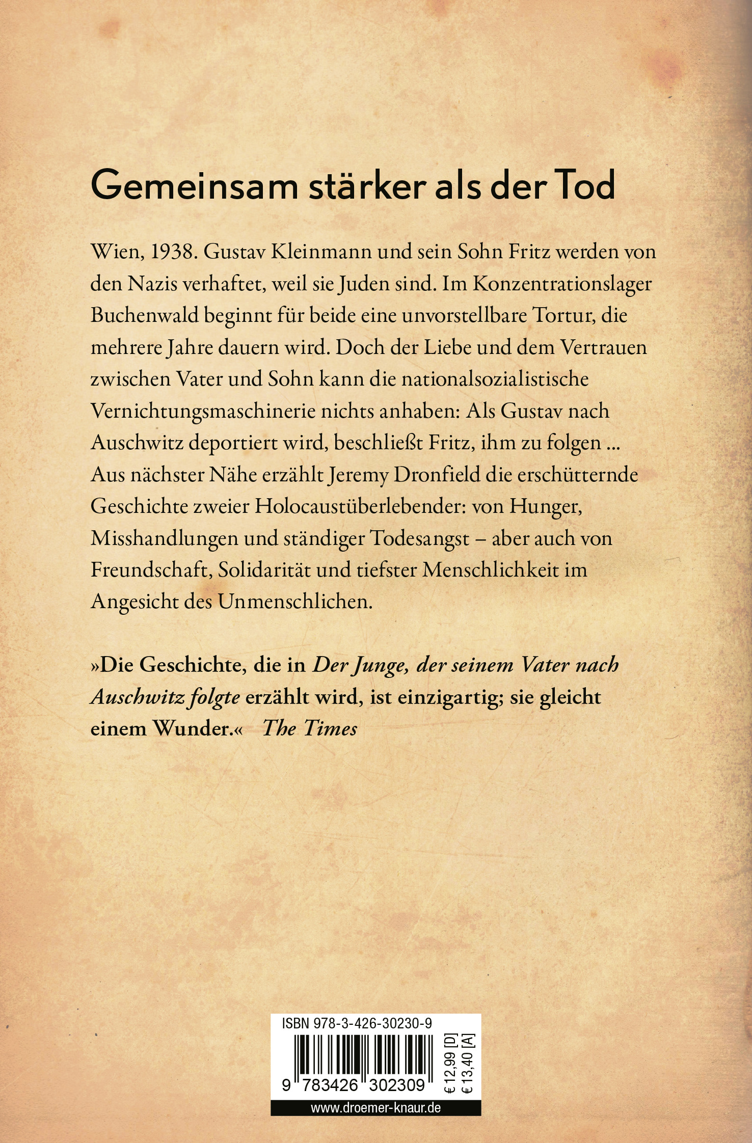 Fritz Kleinmann fasst einen unglaublichen Beschluss. Da er seinen Vater nicht allein lassen will, folgt er ihm nach Auschwitz. Jeremy Dronfields Bestseller „Der Junge, der seinem Vater nach Auschwitz folgte“ ist ein eindringliches Plädoyer gegen das Vergessen. Basierend auf den geheimen Tagebüchern des jüdischen KZ-Häftlings Gustav Kleinmann, erzählt der Autor in diesem historischen Sachbuch die Geschichte von Gustav und seinem Sohn Fritz, die den „Todesfabriken“ der Nazis entkamen.