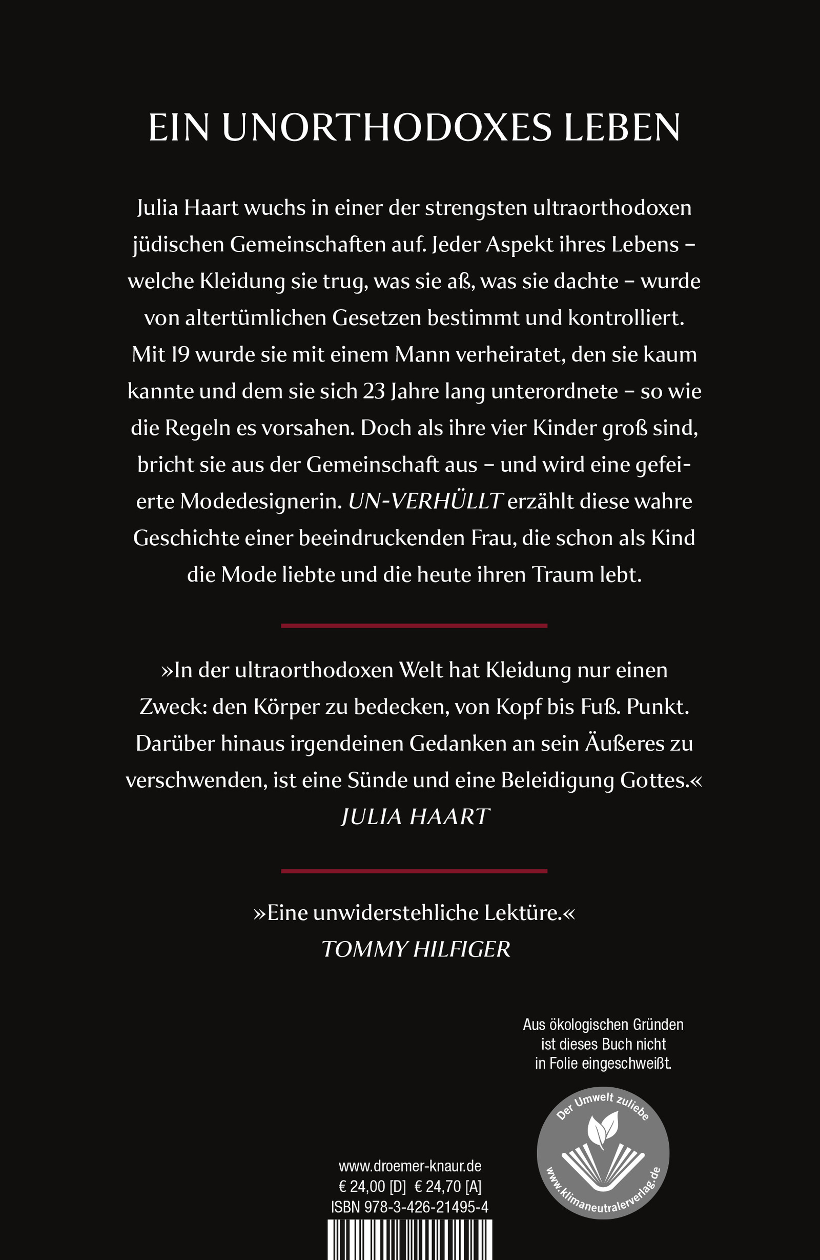"Julia Haarts Biografie ist schonungslos ehrlich. Obwohl sie ihre Zeit in der ultraorthodoxen Gemeinschaft sachlich und durchaus mit Respekt beschreibt, sind die Einblicke in die fundamentalistische Lebensweise erschütternd. Ihr Mut, sich daraus zu lösen, ist bewundernswert. 'Un-verhüllt' ist ein faszinierendes Buch, das man bis zum Schluss nicht aus der Hand legt."