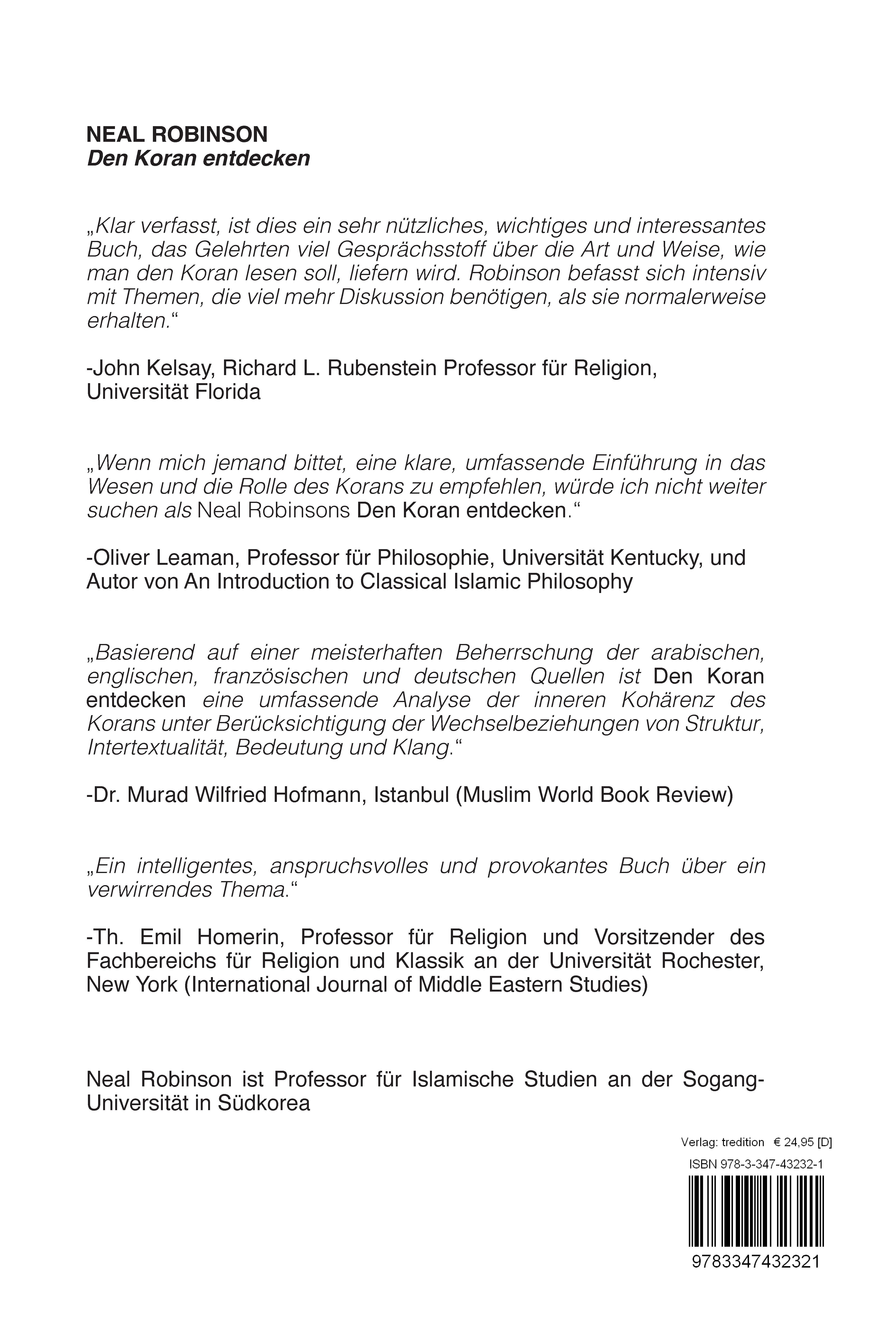 Das Buch "Den Koran entdecken" gilt international als einer der besten Einführungen in den Koran. Es wird sowohl von Studenten als auch von Fachleuten auf der ganzen Welt als zuverlässiger Leitfaden für die Lektüre zum Koran verwendet und zeigt, wie der Koran von Muslimen erlebt wird, indem es die Strukturen des Rhythmus und des Reimschemas, den Kontext, in dem er gehört wird, die Rolle des Auswendiglernens und die Bedeutung der Kalligraphie beschreibt. Es geht auch um den Koran und seine Beziehung zu Mohammed und hilft, die Anordnung der Suren oder Kapitel zu verstehen. Für die deutschsprachigen Leser wird das Buch ein unschätzbares Werkzeug für ein besseres Verständnis sein.
