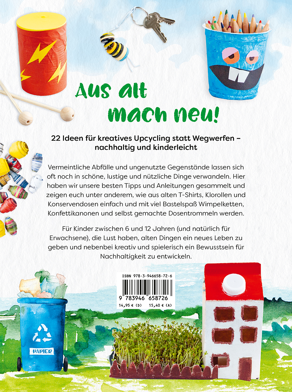 Im ersten Teil der Eco-Kids-Reihe stellen wir unsere schönsten Selbermach- und Upcycling-Projekte für Kinder vor, mit denen sich vermeintliche Abfälle oder ungenutzte Gegenstände in schöne, lustige und nützliche Dinge verwandeln lassen. Wimpelkette, Konfettikanone und selbstgemachte Büchsenbongos sind nur einige der spannenden Ideen für Kinder zwischen 6 und 12 Jahren (und natürlich für Erwachsene), die Lust haben, alten Socken und Textilresten, Eierkartons, Tetrapaks und Klorollen ein neues Leben zu geben und nebenbei kreativ und spielerisch ein Bewusstsein für Nachhaltigkeit zu entwickeln.Mit einfachen Beschreibungen und zahlreichen Illustrationen sind die Bastelanleitungen für Kinder verständlich und leicht umzusetzen.Wir wünschen viel Vergnügen beim Ausprobieren und Entdecken!