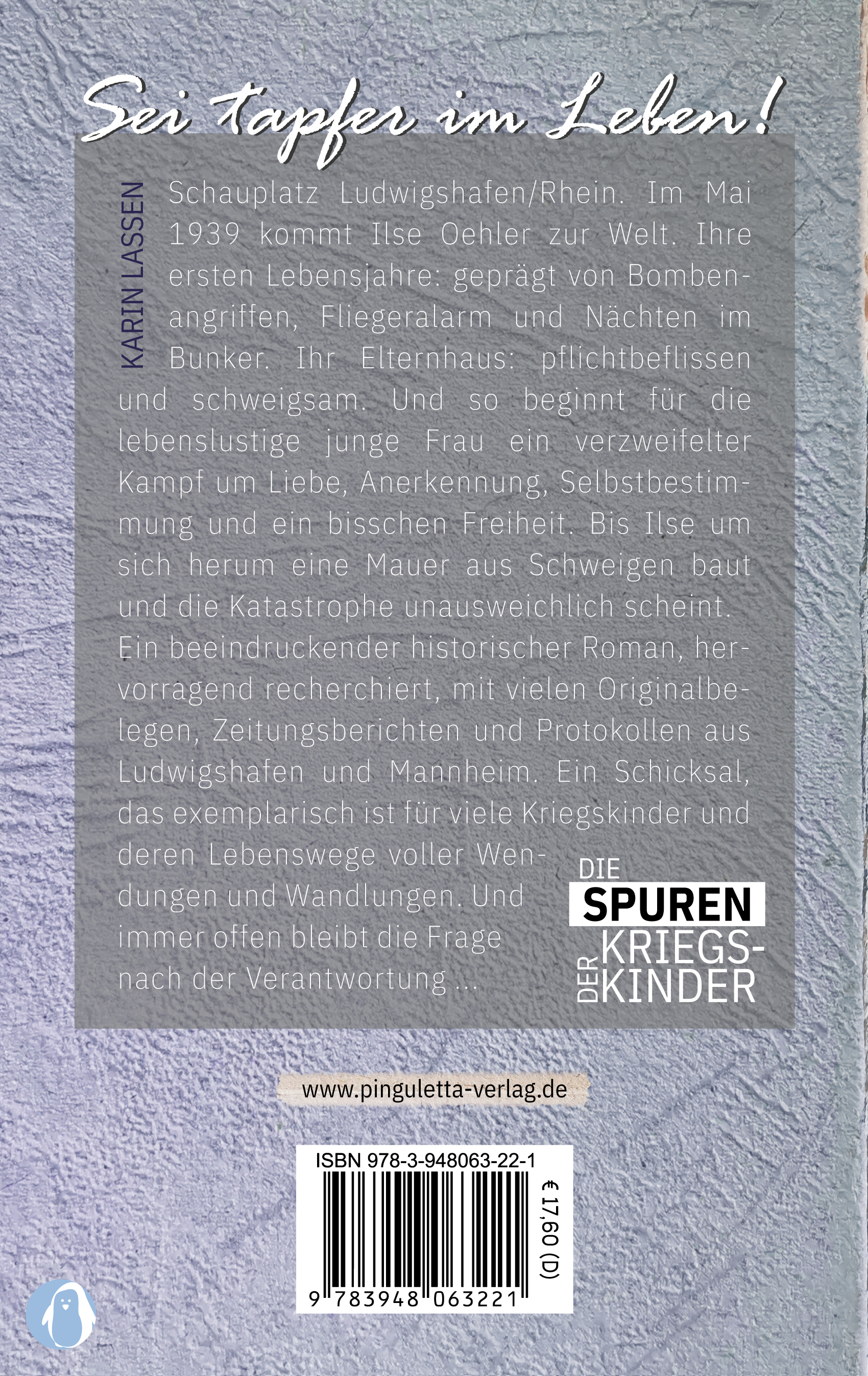 | Schlagworte | Anerkennung • Angst • Anschuldigungen • Antikriegsbuch • Auswirkungen • Berichte • Bombenangriffe • Bunker • Deutsche Geschichte • Familie • Familienbande • Familiengeschichte • Fliegeralarm • Generationen • Gesellschaft • historisch • Im Westen nichts Neues • Kriegsenkel • Kriegserinnerungen • Kriegsjahre • Kriegskinder • Kriegsroman • Kriegszeit • Krieg und Frieden • Lebenswege • Ludwigshafen • Mannheim • Missverständnisse • Moral • Nachkriegszeit • Rückblende • Schicksal • Schrecken • Schweigen • Seele • seelische Wunden • Starke Frauen • Tapferkeit • Trümmerzeit • Unaufgeklärtes • Vorwürfe • Wirtschaftswunder • Zeitgeschichte • Zeitzeugen • Zweiter Weltkrieg |