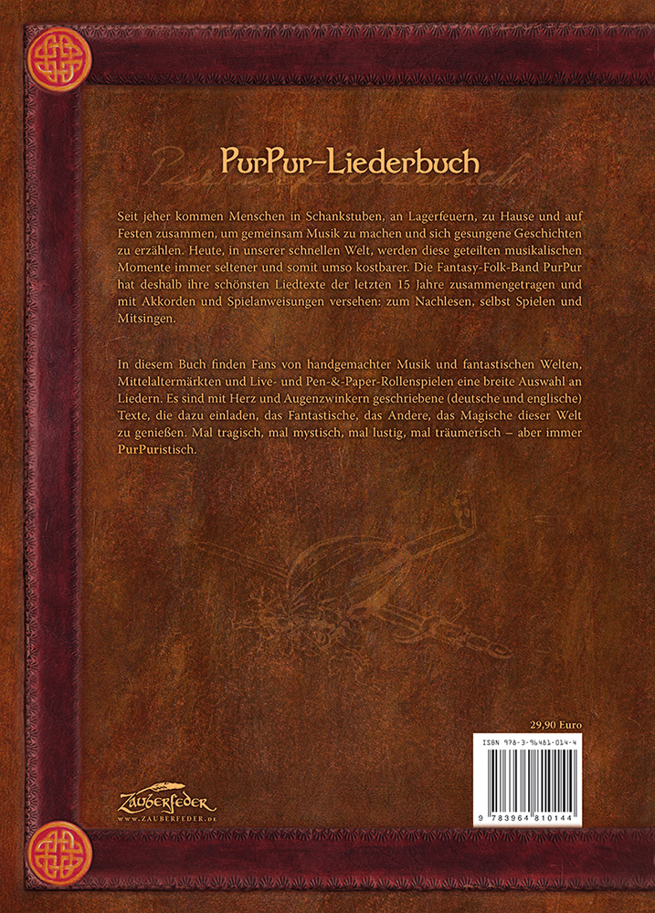 Seit jeher kommen Menschen in Schankstuben, an Lagerfeuern, zu Hause und auf Festen zusammen, um gemeinsam Musik zu machen und sich gesungene Geschichten zu erzählen. Heute, in unserer schnellen Welt, werden diese geteilten musikalischen Momente immer seltener und somit umso kostbarer. Die Fantasy-Folk-Band PurPur hat deshalb ihre schönsten Liedtexte der letzten 15 Jahre zusammengetragen und mit Akkorden und Spielanweisungen versehen: zum Nachlesen, selbst Spielen und Mitsingen. In diesem Buch finden Fans von handgemachter Musik und fantastischen Welten, Mittelaltermärkten und Live- und Pen-&-Paper-Rollenspielen eine breite Auswahl an Liedern. Es sind mit Herz und Augenzwinkern geschriebene (deutsche und englische) Texte, die dazu einladen, das Fantastische, das Andere, das Magische dieser Welt zu genießen. Mal tragisch, mal mystisch, mal lustig, mal träumerisch - aber immer PurPuristisch.