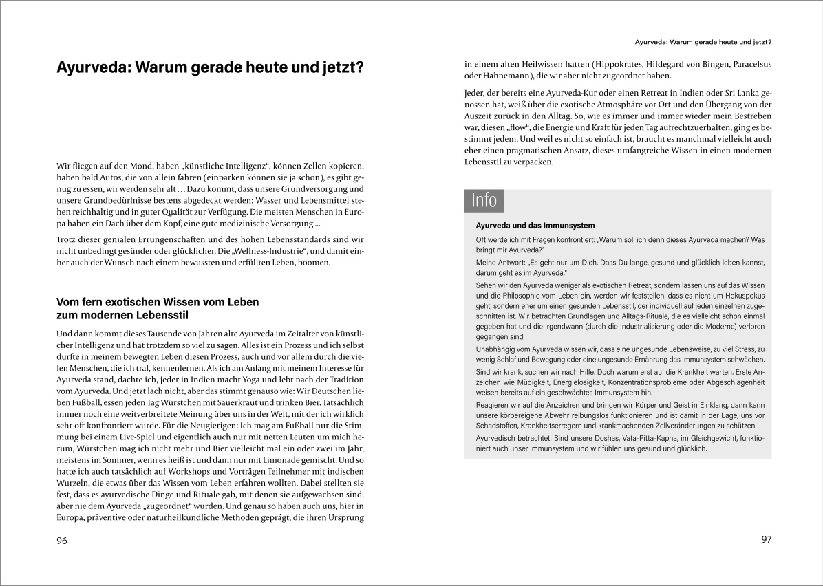 Vorwort Warum dieses Buch? Warum Ayurveda? Kennst du das? Alles soll perfekt sein – vom ersten Moment an. Typische Vorsätze: „Ich möchte dieses oder jenes ändern. Ich möchte gesund sein und mein Leben in vollen Zügen genießen.“ Oder: „Eigentlich sollte ich, um gesund zu bleiben/ zu werden, etwas in meinem Leben ändern, aber ich habe keine Zeit dazu.“ Und dazu gesellen sich gerne noch mehr Punkte auf der Agenda. Leider führt dann der gut gemeinte Aktionismus häufig dazu, dass wir uns zu viel vornehmen und diesen Berg wenig später nicht mehr bewältigen können. Wir sehen dann oftmals den Wald vor lauter Bäumen nicht. Also: Wo fängt man am besten an? Wie kann man das Neue in das bestehende Leben integrieren? Viele Fragen schwirren einem durch den Kopf und oft bekommt man dazu noch viel mehr, teilweise zu viele, Antworten, die in ihrer Fülle eher nicht hilfreich sind. Doch zurück zu unseren guten Vorsätzen für unsere Gesundheit. Warum ist es wichtiger denn je, dass wir abwehrstark und vital sind? Brauchten wir tatsächlich eine Pandemie, die uns aufgeweckt hat? Gab es nicht auch davor schon genügend Anzeichen, wie Allergien, Autoimmun-Störungen oder Gesellschaftskrankheiten, die uns sagten, dass es an der Zeit ist umzudenken? Bereits vor 2019 sind die unterschiedlichsten Ernährungsformen, Diäten, Nahrungsergänzungen oder lebensbereichernde Trends und Programme dank Angebot und Nachfrage sehr stark in den Fokus gerückt. Jedes mit dem Ziel das Leben gesünder, nachhaltiger oder einfach besser zu gestalten. Unsere Gesellschaft hat doch schon längst diese Erkenntnis und eigentlich wissen wir, dass wir noch so viel mehr für unsere Gesundheit tun können. Doch welchem Trend kann man vertrauen? Wo lohnt es sich dranzubleiben? „Was ist das Richtige für mich und wer sagt mir, dass es bei mir wirkt?“ Und genau jetzt kommt nämlich der Ayurveda! Aber nicht erst jetzt oder seitdem es so trendy ist, eine schöne Ölmassage zu bekommen oder leckere Gewürze zu genießen. Seit über 5000 Jahren „erzählt“ Ayurveda das Gleiche! Das Wirkprinzip, die Hintergründe und Methoden haben sich über tausende von Jahren bewährt und rücken nun immer mehr in den Fokus der modernen Medizin. Das Besondere: trotz allgemeiner Empfehlungen gibt es im Ayurveda nicht „die eine Lösung oder die eine Tablette, die für alle gleich wirkt“. Jeder Mensch ist ein Unikat, der individuelle Ansätze benötigt. Und vielleicht fällt Dir jetzt auch gerade wieder ein, dass Du Dich schon häufig gewundert hast, warum eine gute Bekannte so oft krank ist, warum der Arbeitskollege trotz hohem Arbeitspensum nie gestresst ist oder Dein bester Freund weder Sport treibt, noch auf seine Ernährung achtet und trotzdem einen tollen Körper hat. Ayurveda sieht Dich in Deiner Einzigartigkeit und hilft Dir Deine Stärken zu nutzen sowie Deine Schwächen mit Unterstützung von Ernährung und Lebensstil auszugleichen. Der wichtigste und erste Schritt ist deshalb das System des Ayurveda und Deine ayurvedische Grundkonstitution (bei der es ganz viel um die Doshas Vata, Pitta und Kapha geht) zu verstehen. Mit diesem Buch wirst Du Seite für Seite Dich und damit Deine Konstitution entdecken und konkrete Inspirationen bekommen, wie Du Deine Gesundheit und Lebensfreude damit positiv beeinflussen kannst. Auch der Blick auf die Menschen und das was, Dich tagtäglich umgibt in Kombination mit Deinem Wissen zu den drei Doshas und den fünf Elementen werden Dich und Dein Leben bereichern. Schauen wir dann wieder auf Deinen persönlichen Wunsch nach Veränderung oder mehr gesundheitsfördernde Aspekte in Dein Leben zu integrieren, wirst Du feststellen, dass der Weg dahin Dein eigener, ganz individueller ist. Und ein Großteil auch abhängig von Deiner „Personal Ayurveda ID“, die Du auf den nächsten Seiten noch besser kennen lernen wirst. Dominiert zum Beispiel das kämpferische und strukturierte Pitta in Dir, wirst Du Dich weit vorbeißen und einiges schaffen. Aber wird es Dich am Ende und andere glücklich machen? Oder ist es das luftige Vata, was mal wieder Lust auf was Neues hat und Dich nach vorne preschen lässt? Doch nach kurzer Zeit kann die Vision schon am Horizont verschwunden oder gegen neue Ideen ausgetauscht wurden sein, bevor Du überhaupt mit der Umsetzung angefangen hast. Doch wie kannst Du denn, so wie Du bist, mit Deinen Stärken und Schwächen in Dein Leben, mehr gesundheitliche Aspekte integrieren? Die Antwort ist einfach: Einfach machen! Schritt für Schritt ist die Devise. Ähnlich wie beim Laufen oder anderen Dingen, die Dir Spaß machen und wo Du merkst, dass es Dir guttut und du immer weiter und mehr läufst, statt dich zu überwinden und zu quälen. Qual! Ja natürlich: Es ist immer ein bisschen Überwindung und Qual mit dabei – und damit geht auch wieder jeder Mensch anders um. „Da muss ich jetzt durch!“ „Muss ich da durch?“ „Ich mag da nicht durch!“ Kapha-Dosha quält sich mehr und braucht länger, wenn es um Veränderung und Aktion geht, während Vata das Neue gar nicht abwarten kann. Doch zum Glück hat jeder von uns eine Mischung aus allen drei Doshas – Vata, Pitta und Kapha – in seiner Grundkonstitution und damit schafft man alles und vor allem das, was einem guttut. Wenn Du den positiven Aspekt siehst, dass es nämlich um Dein Leben, Deine Gesundheit und Deine Zeit geht, dann brauchst Du eigentlich nicht lange nachzudenken. Happiness is a choice (= Glück ist eine Wahl). Ayurveda ist faszinierend, lebendig – gewöhnlich außergewöhnlich! In den letzten Jahren konnten sich viele Menschen von dieser ganzheitlichen Lehre begeistern lassen. Mit dem Wissen vom Leben wurde gekurt, gelesen, neu geboren, geheilt, gedetoxt, gekocht, abgenommen oder Frieden mit sich selbst gefunden ... Hier mit diesem Buch möchte ich allen helfen, vieles ansprechen und praktische Tipps und Inspiration schaffen, wie Ayurveda in den (Berufs-)Alltag integriert werden kann. In einen Allt