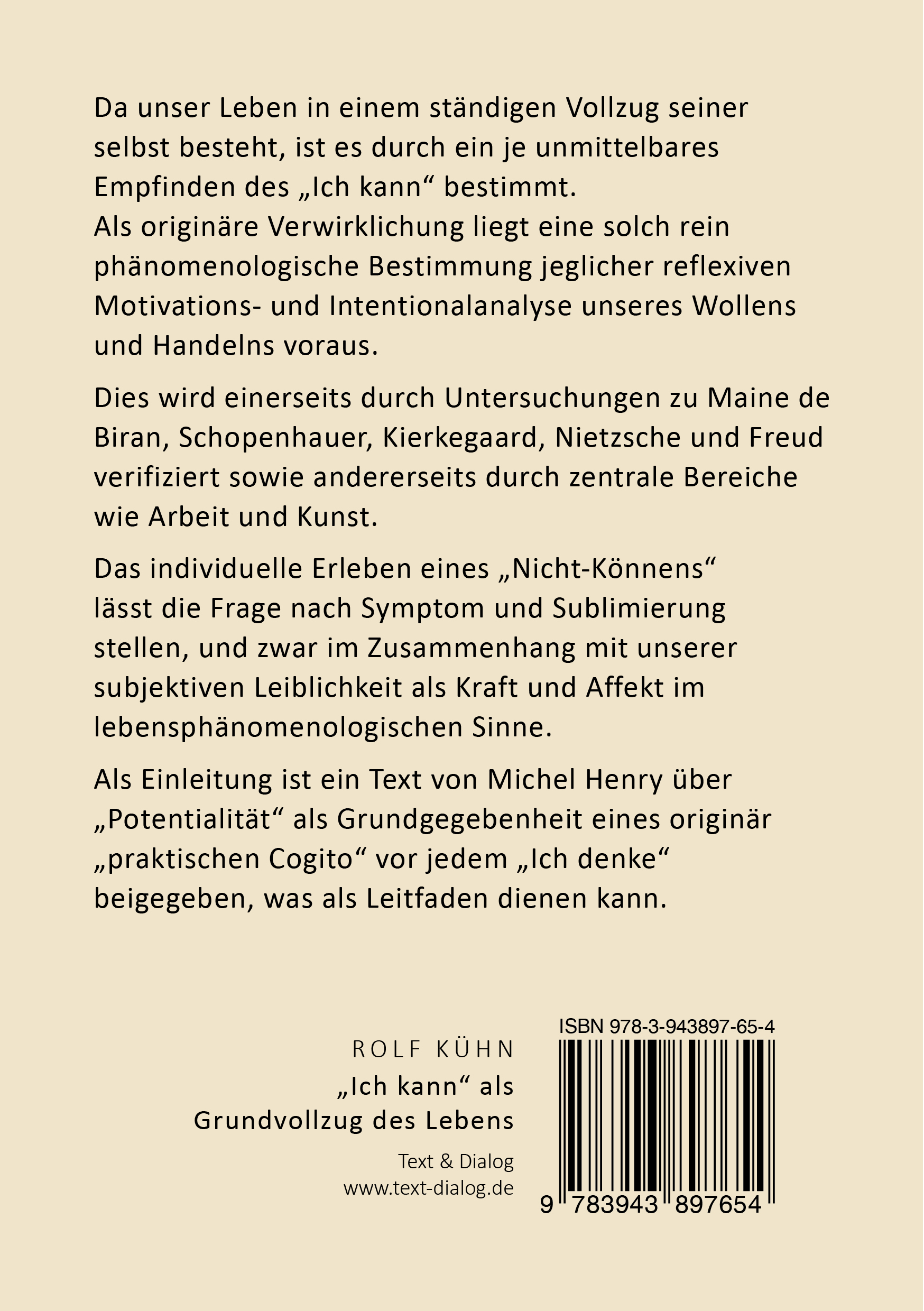 Rolf Kühn, Dr. phil. Paris-Sorbonne, philos. Habil. Univ. Wien; Univ.-Dozent für Philosophie in Wien, Beirut, Nizza, Lissabon, Louvain-la-Neuve, Freiburg/Br. (Leiter der Forschungsstelle für jüngere französische Religionsphilosophie); zahlreiche Veröffentlichungen in Phänomenologie, psychologischer Anthropologie, Kultur- und Religionsphilosophie; Übersetzer wichtiger Werke Maine de Birans und Michel Henrys ins Deutsche; Herausgeber der Reihe „Seele, Existenz und Leben“ im Karl Alber Verlag; Leiter des „Forschungskreises Lebensphänomenologie“ (www.lebensphaenomenologie.de); Lehrausbilder und Supervisor in Existenzanalyse (Réseau de Logothérapie France). Letzte Hauptveröffentlichungen: Subjektive Praxis und Geschichte. Phänomenologie der politischen Aktualität, 2008; Praxis der Phänomenologie. Einübungen ins Unvordenkliche, 2009; Natur und Leben. Entwurf einer aisthetischen Proto-Kosmologie, 2011; „Ungeteiltheit“ – oder Mystik als Ab-Grund der Erfahrung. Ein radikal phänomenologisches Gespräch mit Meister Eckhart, 2012; Individuation et vie culturelle. Pour une phénoménologie radicale dans la perspective de Michel Henry, 2012; L’abîme de l’épreuve. Phénoménologie matérielle en son archi-intelligibilité, 2013; Religion und passio. Texte zur neueren französischen Religionsphilosophie (Hg.), 2013.