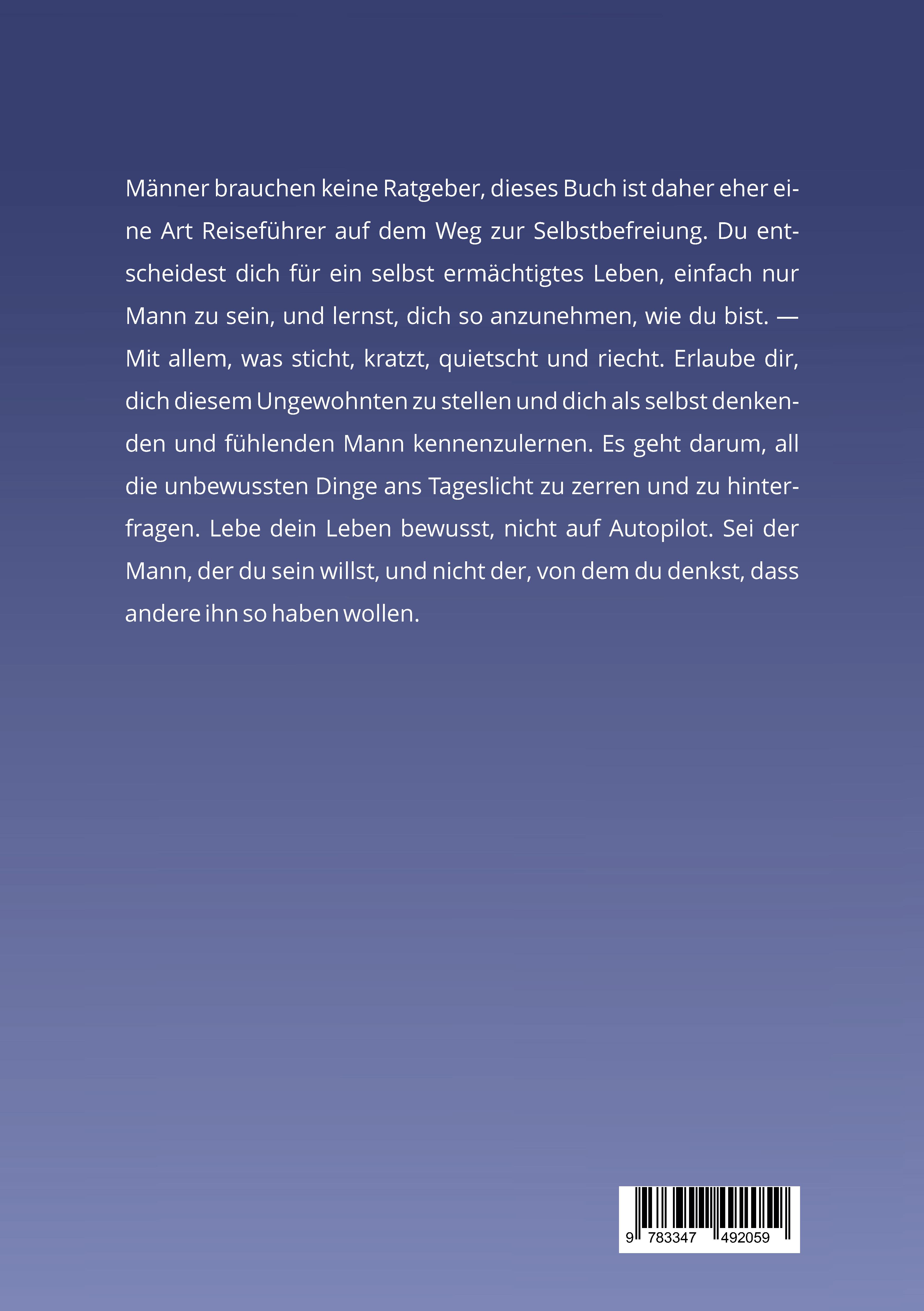 Männer brauchen keine Ratgeber, dieses Buch ist daher eher eine Art Reiseführer auf dem Weg zur Selbstbefreiung. Du entscheidest dich für ein selbst ermächtigtes Leben, einfach nur Mann zu sein, und lernst, dich so anzunehmen, wie du bist. - Mit allem, was sticht, kratzt, quietscht und riecht. Erlaube dir, dich diesem Ungewohnten zu stellen und dich als selbst denkenden und fühlenden Mann kennenzulernen. Es geht darum, all die unbewussten Dinge ans Tageslicht zu zerren und zu hinterfragen. Lebe dein Leben bewusst, nicht auf Autopilot. Sei der Mann, der du sein willst, und nicht der, von dem du denkst, dass andere ihn so haben wollen.