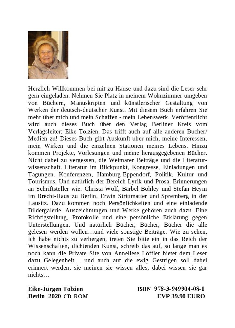 Herzlich Willkommen bei mit zu Hause und dazu sind die Leser sehr gern eingeladen. Nehmen Sie Platz in meinem Wohnzimmer umgeben von Büchern, Manuskripten und künstlerischer Gestaltung von Werken der deutsch-deutscher Kunst. Mit diesem Buch erfahren Sie mehr über mich und mein Schaffen - mein Lebenswerk. Veröffentlicht wird auch dieses Buch über den Verlag Berliner Kreis vom Verlagsleiter: Eike Tolzien. Das trifft auch auf alle anderen Bücher/Medien zu! Dieses Buch gibt Auskunft über mich, meine Interessen, mein Wirken und die einzelnen Stationen meines Lebens. Hinzu kommen Projekte, Vorlesungen und meine herausgegeben Bücher. Nicht zu vergessen die Weimarer Beiträge und die Literaturwissenschaft. Literatur im Blickpunkt, Kongresse, Einladungen und Tagungen. Konferenzen, Hamburg-Eppendorf, Politik, Kultur und Tourismus. Und natürlich der Bereich Lyrik und Prosa. Erinnerungen an Schriftsteller wie: Christa Wolf, Bärbel Bohley und Stefan Heym im Brecht-Haus zu Berlin. Erwin Strittmatter und Spremberg in der Lausitz. Dazu kommen noch Persönlichkeiten und eine einladende Bildergalerie. Auszeichnungen und Werke gehören auch dazu. Eine Richtigstellung, Protokolle und eine persönliche Erklärung gegen Unterstellungen. Und natürlich Bücher, Bücher, Bücher die alle gelesen werden wollen…und viele sonstige Beiträge. Wie zu sehen, ich habe nichts zu verbergen, treten Sie bitte ein in das Reich der Wissenschaften, dichtenden Kunst, schreib das auf, so lange man es noch kann die Private Site von Anneliese Löffler bietet dem Leser dazu Gelegenheit… und auch auf die ewig Gestrigen soll dabei erinnert werden, sie meinen sie wissen alles, dabei wissen sie gar nichts.