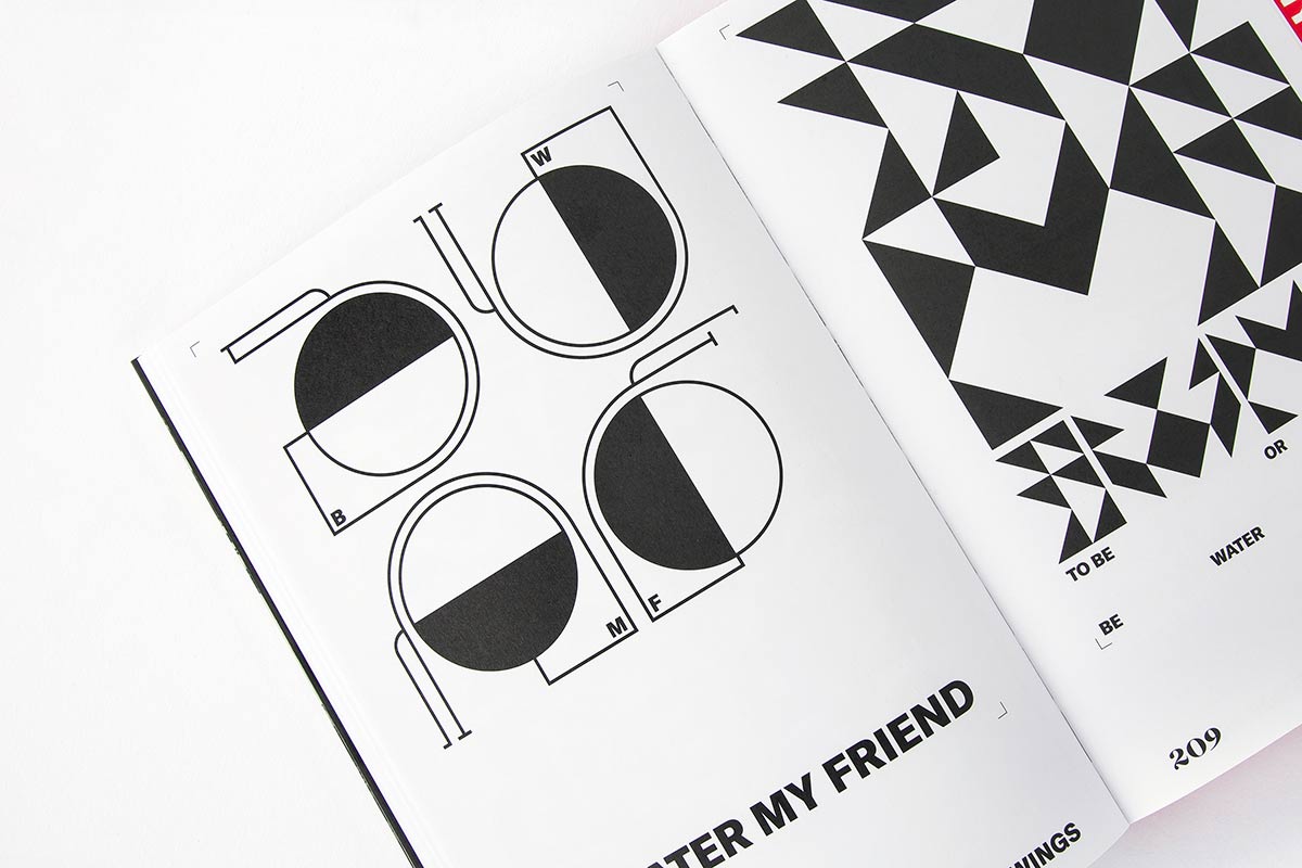 Inspiriert durch ein Interview mit Bruce Lee, in dem dieser auf einen Aspekt der taoistischen Philosophie verweist, nämlich dass Wasser uns »den Weg« lehren kann, begann der Grafikdesigner, Aktivist, Dozent, Autor und Gründer des gleichnamigen Studios für Markenkommunikation Rafael Bernardo sich zu fragen, ob er in seinem kreativen Workflow »Wasser« sei. Jetzt, fünf Jahre später, hat er ein Buch mit 224 Seiten geschrieben und gestaltet, das 50/50 in die Teile Roots und Wings unterteilt ist. Wings zeigt seine grafische Reise: Elf von Bernardos persönlichen Lieblingsprojekten und Gemeinschaftsarbeiten, die er zum Beispiel mit Viva con Agua, dem Forward Festival oder der Porzellanfabrik Rosenthal durchgeführt hat. Eine Auswahl von achtzig Be Water My Friend-Postern, dokumentieren seine Reise, auf der er seine visuelle Stimme zu erprobt und erkundet hat. Klare Kompositionen in Schwarz und Weiß innerhalb des Spektrums von Typografie, Illustration und Infografik.Teil zwei, Roots, umreißt die theoretischen Grundlagen von Rafael Bernardos Erfahrung. Die Einführung der Methodik Be Water My Friend. Ein analytisches System, das er entwickelte, nachdem er herausgefunden hatte, dass sich Wasser so verhält, wie Kreativität funktioniert.Es beschreibt den Fortschritt der Entwicklung als ein Uhrwerk, das in drei Ebenen unterteilt ist. Kontext außen, Motivation in der Mitte und Prozess als verbindendes Element dazwischen. Es ist ein Werkzeug, um die Art und Weise, wie wir denken, mit der Art und Weise, wie wir fühlen, zu verbinden, indem wir untersuchen, wie wir unsere Prozesse, Projekte und Routinen gestalten und steuern.Bernardo ist davon überzeugt, dass jeder Mensch Kreativität auf unterschiedliche Weisen erlebt, dass aber die Strukturen und Funktionen für alle ähnlich funktionieren. Die erste Frage ist immer, ob man weiß, was man will, ob man es gerne tut und ob man gut darin ist. Die zweite Frage ist, ob man weiß, wie man die kleinen versteckten Fehler findet, die einen daran hindern besser zu werden. Dieses Buch möchte Kreativschaffende dazu inspirieren, Denkweisen und Intuition als Team zu sehen und zeigt, wie man sie miteinander verbindet und aufeinander abstimmt, indem man über Zeit, Träume und Potenziale nachdenkt.Da Wasser in Kreisläufen fließt und »nomen est omen«, ist das Buch auf drei verschiedenen Arten von 100%igem Recyclingpapier, mit Farben auf Wasserbasis und von einer Druckerei gedruckt, die ihren ökologischen Fußabdruck kompensiert. Das Format beträgt 16 × 24 cm, die Volltonfarbe ist Pantone 032U, alle Schriften im Layout mit Ausnahme einer von Bernardo selbst gestalteten wurden von newglyph entworfen.