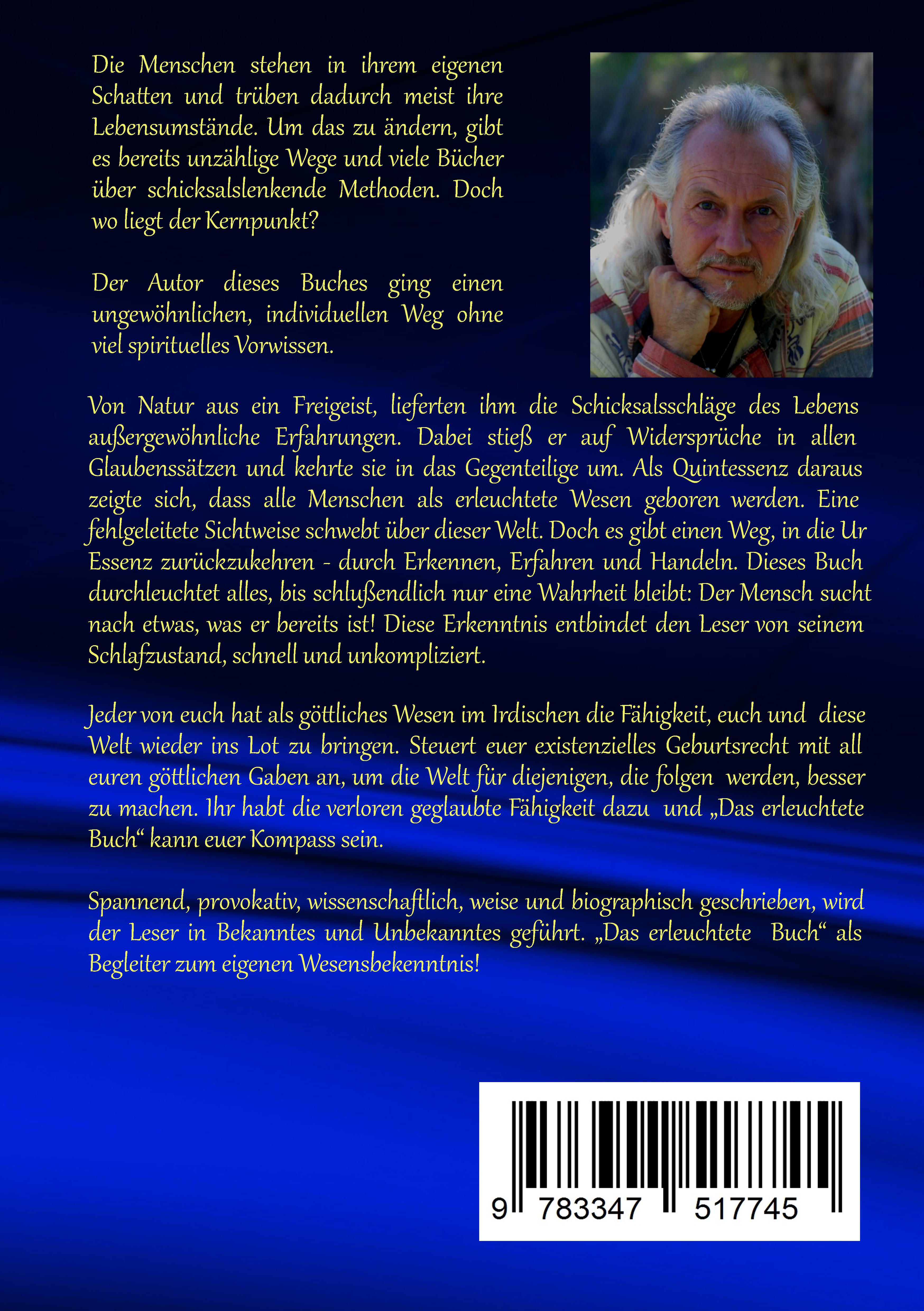 Die Menschen stehen in ihrem eigenen Schatten und trüben dadurch meist ihre Lebensumstände. Um das zu ändern, gibt es bereits unzählige Wege und viele Bücher über schicksalslenkende Methoden. Doch wo liegt der Kernpunkt? Der Autor dieses Buches ging einen ungewöhnlichen, individuellen Weg ohne viel spirituelles Vorwissen. Von Natur aus ein Freigeist, lieferten ihm die Schicksalsschläge des Lebens außergewöhnliche Erfahrungen. Dabei stieß er auf Widersprüche in allen Glaubenssätzen und kehrte sie in das Gegenteilige um. Als Quintessenz daraus zeigte sich, dass alle Menschen als erleuchtete Wesen geboren werden. Eine fehlgeleitete Sichtweise schwebt über dieser Welt. Doch es gibt einen Weg, in die Ur-Essenz zurückzukehren - durch Erkennen, Erfahren und Handeln. Dieses Buch durchleuchtet alles, bis schlussendlich nur eine Wahrheit bleibt: Der Mensch sucht nach etwas, was er bereits ist! Diese Erkenntnis entbindet den Leser von seinem Schlafzustand, schnell und unkompliziert. Jeder von euch hat als göttliches Wesen im Irdischen die Fähigkeit, euch und diese Welt wieder ins Lot zu bringen. Steuert euer existenzielles Geburtsrecht mit all euren göttlichen Gaben an, um die Welt für diejenigen, die folgen werden, besser zu machen. Ihr habt die verloren geglaubte Fähigkeit dazu und "Das erleuchtete Buch" kann euer Kompass sein.Spannend, provokativ, wissenschaftlich, weise und biographisch geschrieben, wird der Leser in Bekanntes und Unbekanntes geführt. "Das erleuchtete Buch" als Begleiter zum eigenen Wesensbekenntnis!
