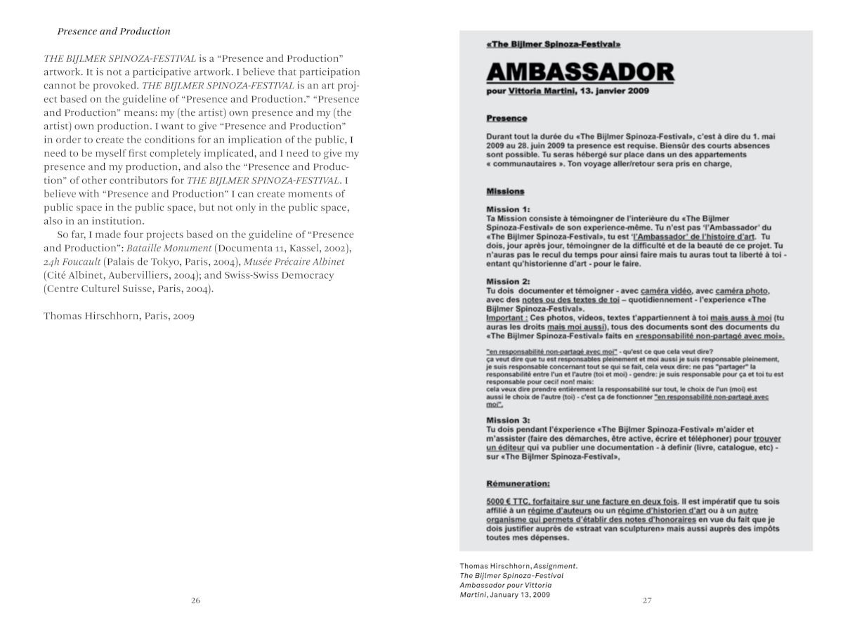 lt;p>The Bijlmer Spinoza-Festival is an artwork, a sculpture, created by Swiss artist Thomas Hirschhorn in a peripheral borough of Amsterdam's south-east known as the Bijlmer in 2009. This book recounts the event through the eyes of its "Ambassador", art historian Vittoria Martini, who was invited by the artist to be an eyewitness to the existence of this "precarious" work. A term Hirschhorn sees as positive and creative: a means of asserting the importance of the moment and of the place, of asserting the Here and Now to touch eternity and universality. Appreciating the art historian's presence as a central element of his sculpture, Hirschhorn consciously challenged the certainties of the profession by empowering and activating the role, thus leading Martini to find a new working methodology that she calls "precarious art history". Accompanying the readers through her experience of the physical existence of The Bijlmer Spinoza-Festival, Martini's commentary leads to the profound understanding of how a work that no longer exists physically, can live on in the mind- elsewhere, at some other time-because in the meantime it has become universal.