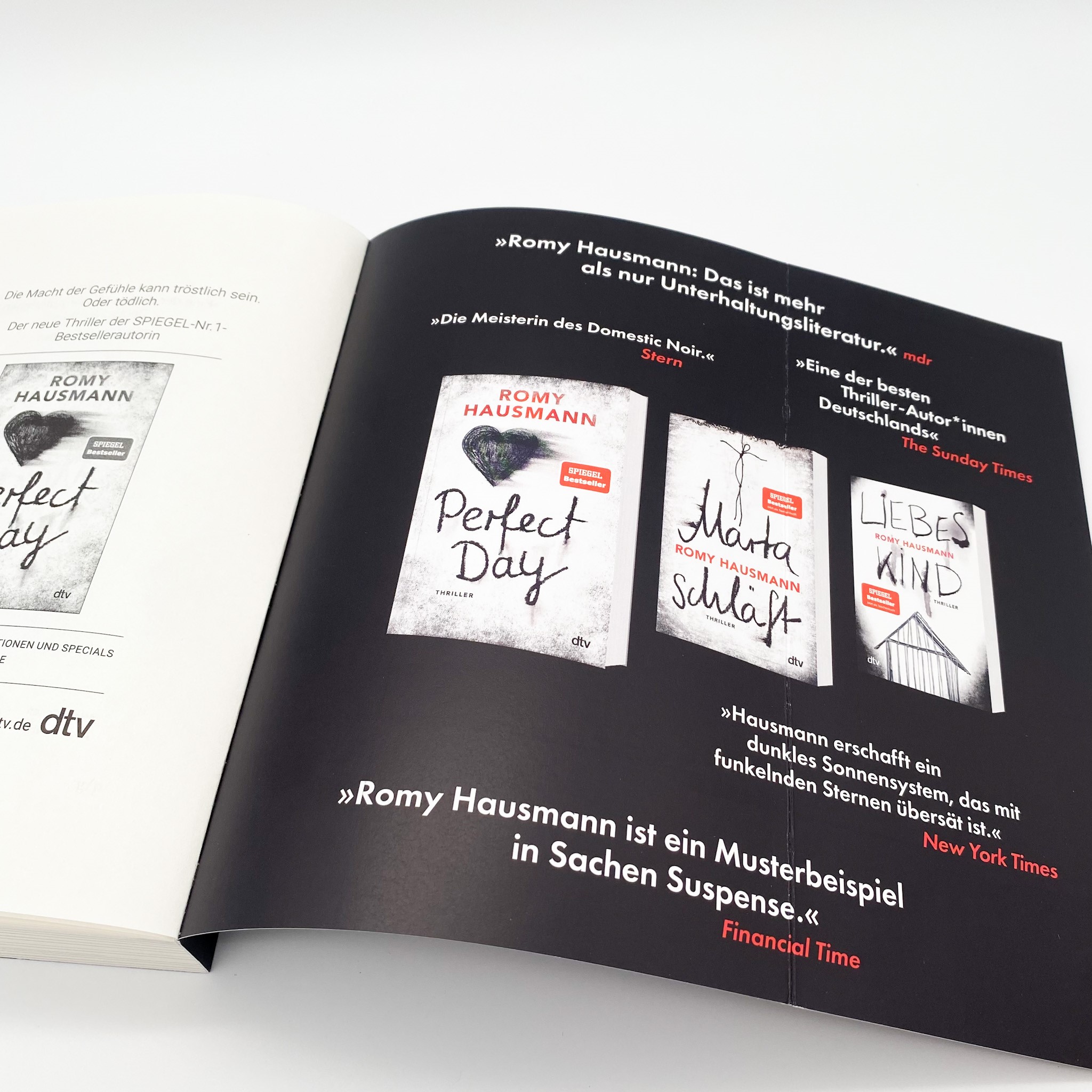 Romy Hausmann, Jahrgang 1981, hat sich 2019 mit ihrem Thrillerdebüt ›Liebes Kind‹ sogleich an die Spitze der deutschen Spannungsliteratur geschrieben: ›Liebes Kind‹ landete auf Platz 1 der SPIEGEL-Bestsellerliste, mit ›Marta schläft‹ folgte 2020 ihr zweiter Bestseller. Übersetzungen ihrer Bücher erscheinen in 26 Ländern, die Filmrechte wurden hochkarätig verkauft. Romy Hausmann wohnt mit ihrer Familie in einem abgeschiedenen Waldhaus in der Nähe von Stuttgart. Auch ihr dritter Thriller ›Perfect Day‹ landete sofort nach Erscheinen 2022 auf Platz 2 der SPIEGEL-Bestsellerliste. Weitere Informationen unter www.romy-hausmann.de