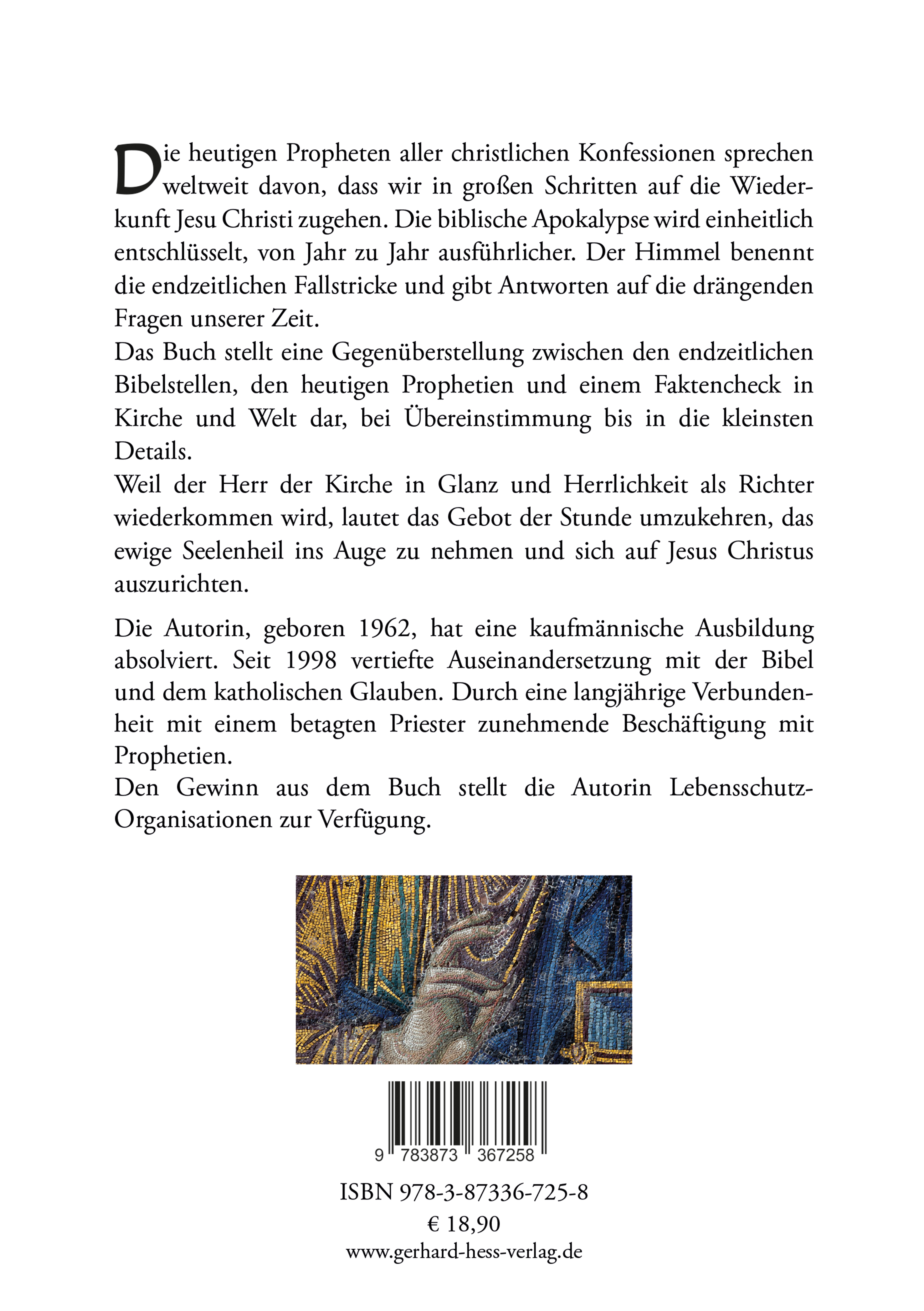 Die heutigen Propheten aller christlichen Konfessionen sprechen weltweit davon, dass wir in großen Schritten auf die Wiederkunft Jesu Christi zugehen. Die biblische Apokalypse wird einheitlich entschlüsselt, von Jahr zu Jahr ausführlicher. Der Himmel benennt die endzeitlichen Fallstricke und gibt Antworten auf die drängenden Fragen unserer Zeit. Das Buch stellt eine Gegenüberstellung zwischen den endzeitlichen Bibelstellen, den heutigen Prophetien und einem Faktencheck in Kirche und Welt dar, bei Übereinstimmung bis in die kleinsten Details. Weil der Herr der Kirche in Glanz und Herrlichkeit als Richter wiederkommen wird, lautet das Gebot der Stunde umzukehren, das ewige Seelenheil ins Auge zu nehmen und sich auf Jesus Christus auszurichten. Die Autorin, geboren 1962, hat eine kaufmännische Ausbildungabsolviert. Seit 1998 vertiefte Auseinandersetzung mit der Bibel und dem katholischen Glauben. Durch eine langjährige Verbundenheit mit einem betagten Priester zunehmende Beschäftigung mit Prophetien. Den Gewinn aus dem Buch stellt die Autorin Lebensschutz-Organisationen zur Verfügung.